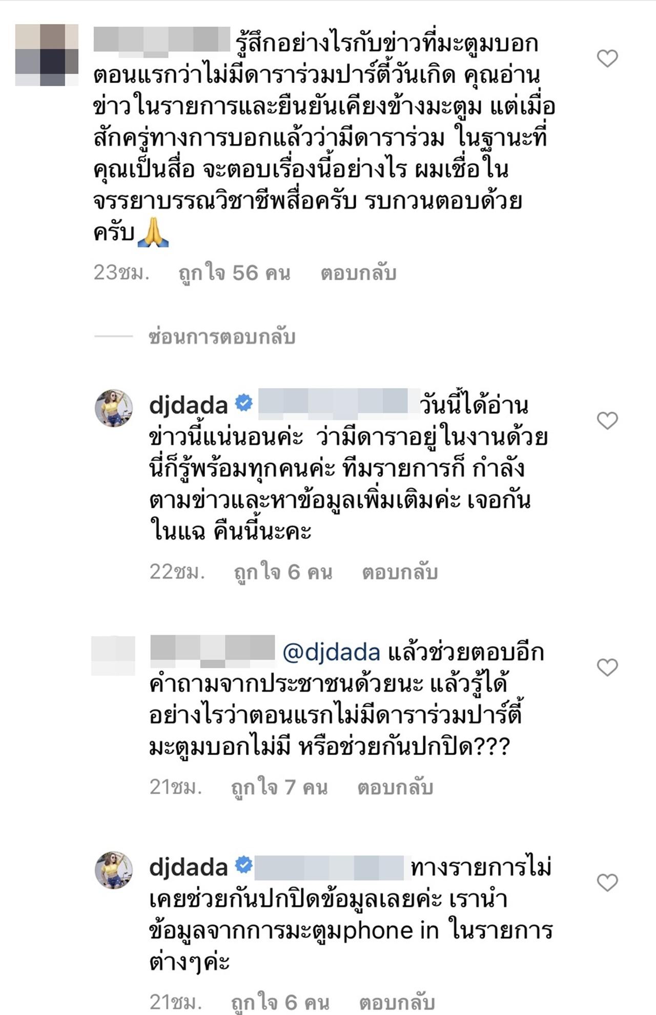 และในอินสตาแกรมของ ดีเจดาด้า ก็มีชาวเน็ตเข้าไปตั้งคำถามถึงจรรยาบรรณในฐานะสื่อและช่วยเพื่อนปกปิดข้อมูลตามที่ชาวเน็ตมองหรือไม่ และงานนี้เจ้าตัวก็ไม่รอช้า มาตอบอย่างชัดเจนว่า
