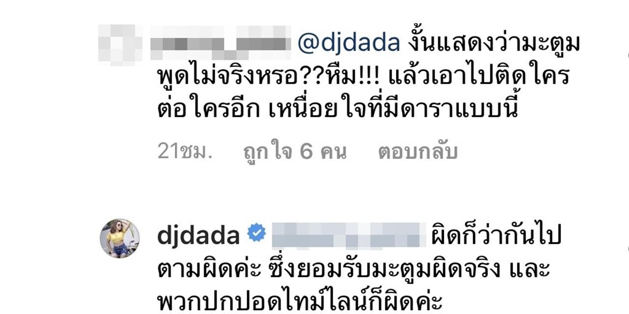 และดีเจดาด้าก็ตอบกลับคอมเมนต์อีกว่า "ผิดก็ว่ากันไปตามผิดค่ะ ซึ่งยอมรับมะตูมผิดจริง และพวกปกปิดไทม์ไลน์ก็ผิดค่ะ"