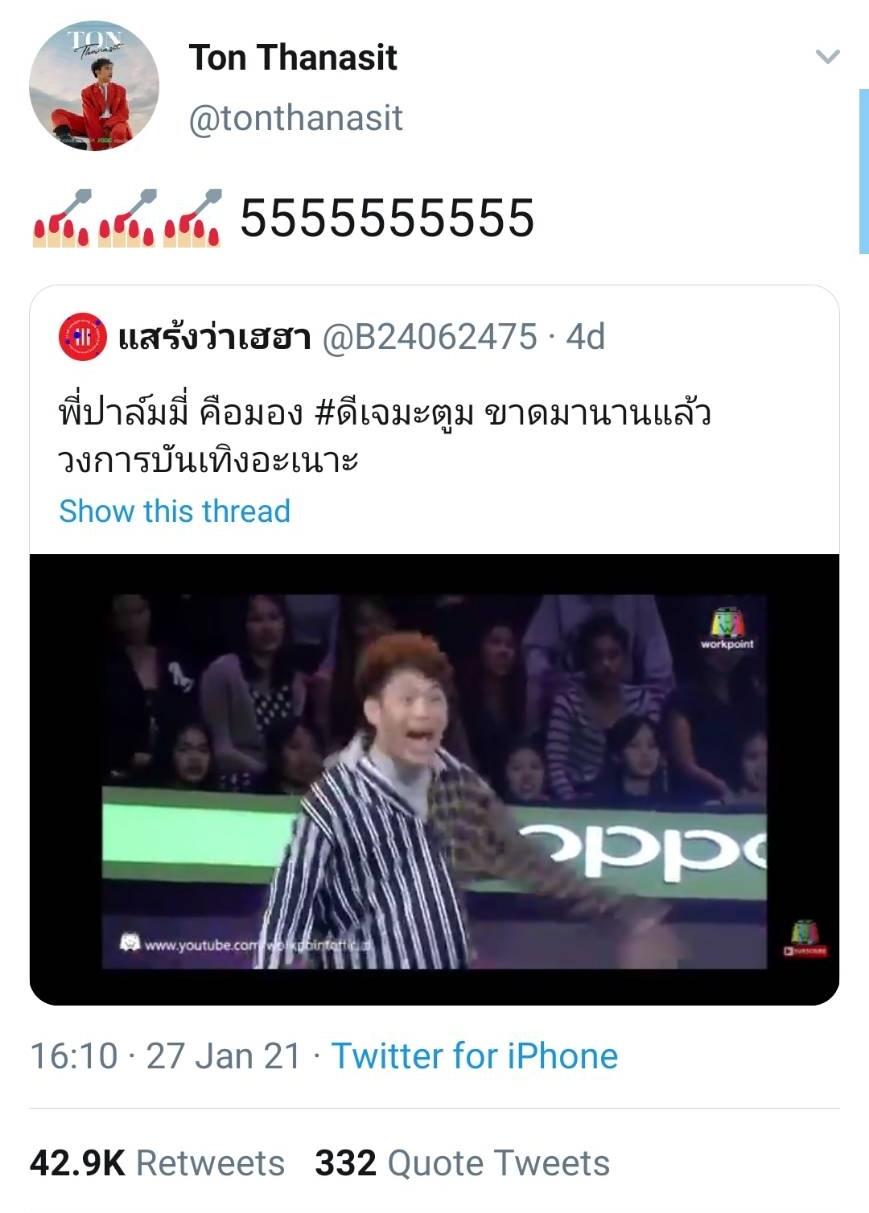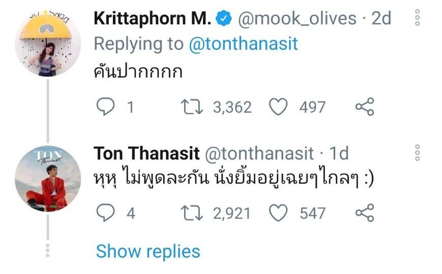 จากนั้น มุก กฤตพร มณฑีรรัตน์ หรือ มุก โอลีฟ ก็ได้ทวีตสั้นๆ แต่กระตุกต่อมเผือกชาวเน็ต “คันปากกกก” และ ต้น ธนษิต ตอบกลับไปว่า “หุหุ ไม่พูดละกัน นั่งยิ้มอยู่เฉยๆ ไกลๆ :)” ด้วย.