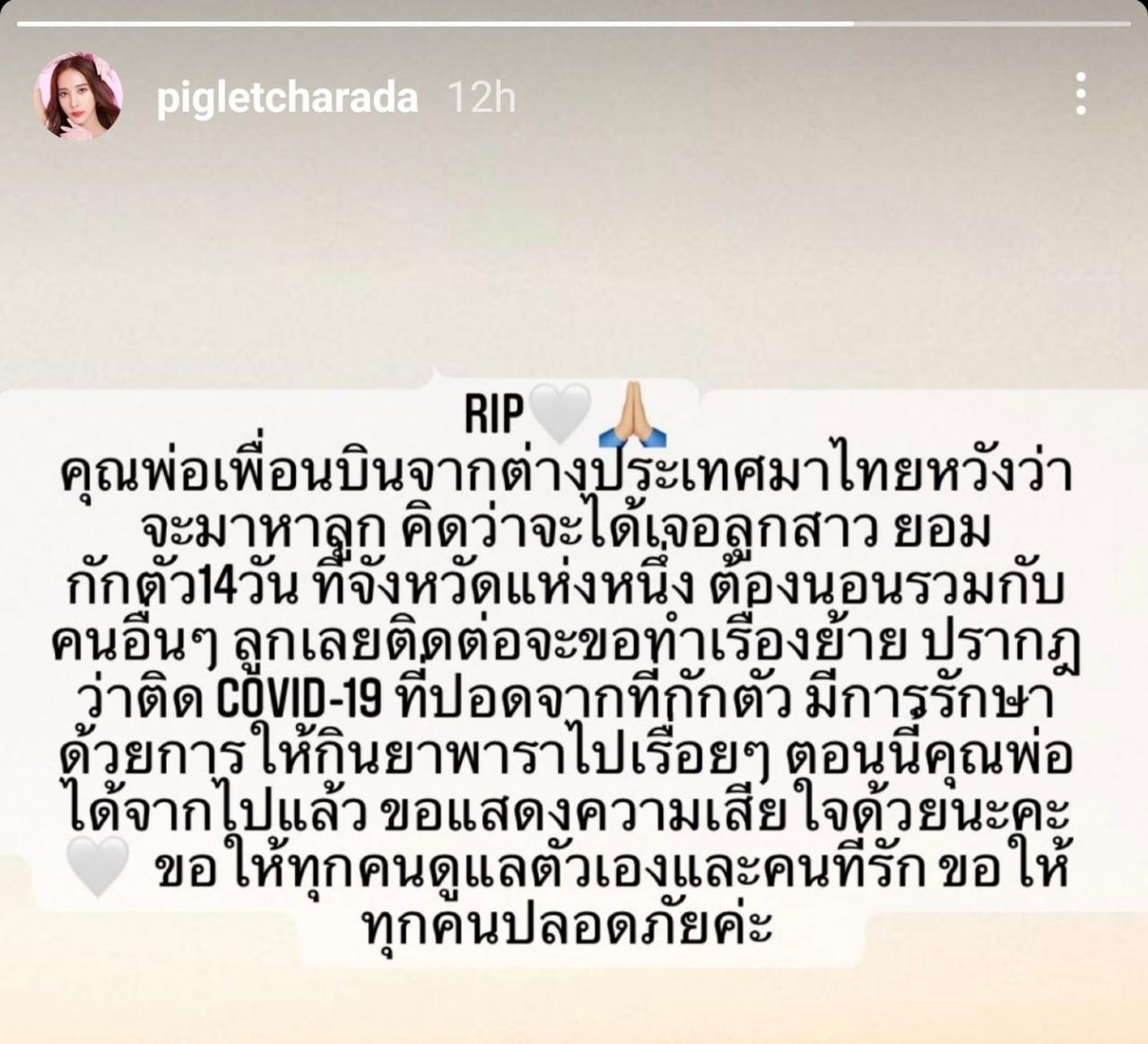 พิกเล็ท ได้โพสต์ไว้ดังนี้ “คุณพ่อเพื่อน บินจากต่างประเทศมาไทยหวังว่า จะมาหาลูก คิดว่าจะได้เจอลูกสาว ยอมกักตัว 14 วัน ที่จังหวัดแห่งหนึ่ง ต้องนอนรวมกับคนอื่นๆ ลูกเลยติดต่อจะขอทำเรื่องย้าย ปรากฏว่าติด COVID-19 ที่ปอดจากที่กักตัว มีการรักษาด้วยการให้กินยาพาราไปเรื่อยๆ ตอนนี้คุณพ่อได้จากไปแล้ว ขอแสดงความเสียใจด้วยนะคะ ขอให้ทุกคนดูแลตัวเองและคนที่รัก ขอให้ทุกคนปลอดภัยค่ะ”