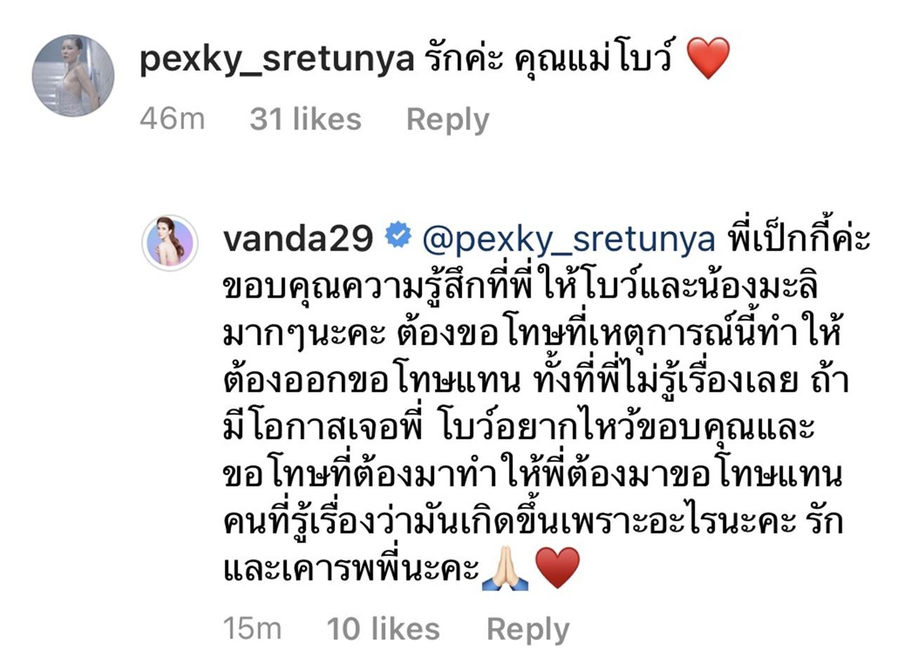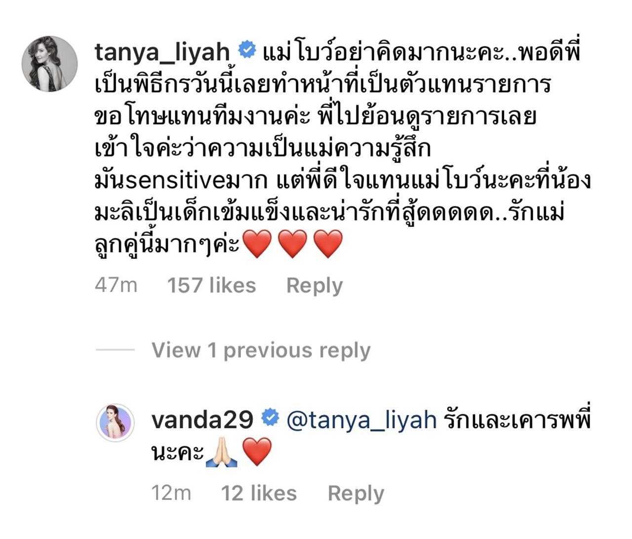 และล่าสุด โบว์ แวนด้า ได้โพสต์อินสตาแกรมถึงเรื่องดังกล่าวว่า “โบว์ขอขอบคุณจากความรู้สึกจากใจ ขอบคุณพี่ธัญญ่าที่เข้าใจความรู้สึกของคนเป็นแม่ ขอบคุณที่ยังมองเห็นความรู้สึกเล็กๆ ของเราสองคนแม่ลูก