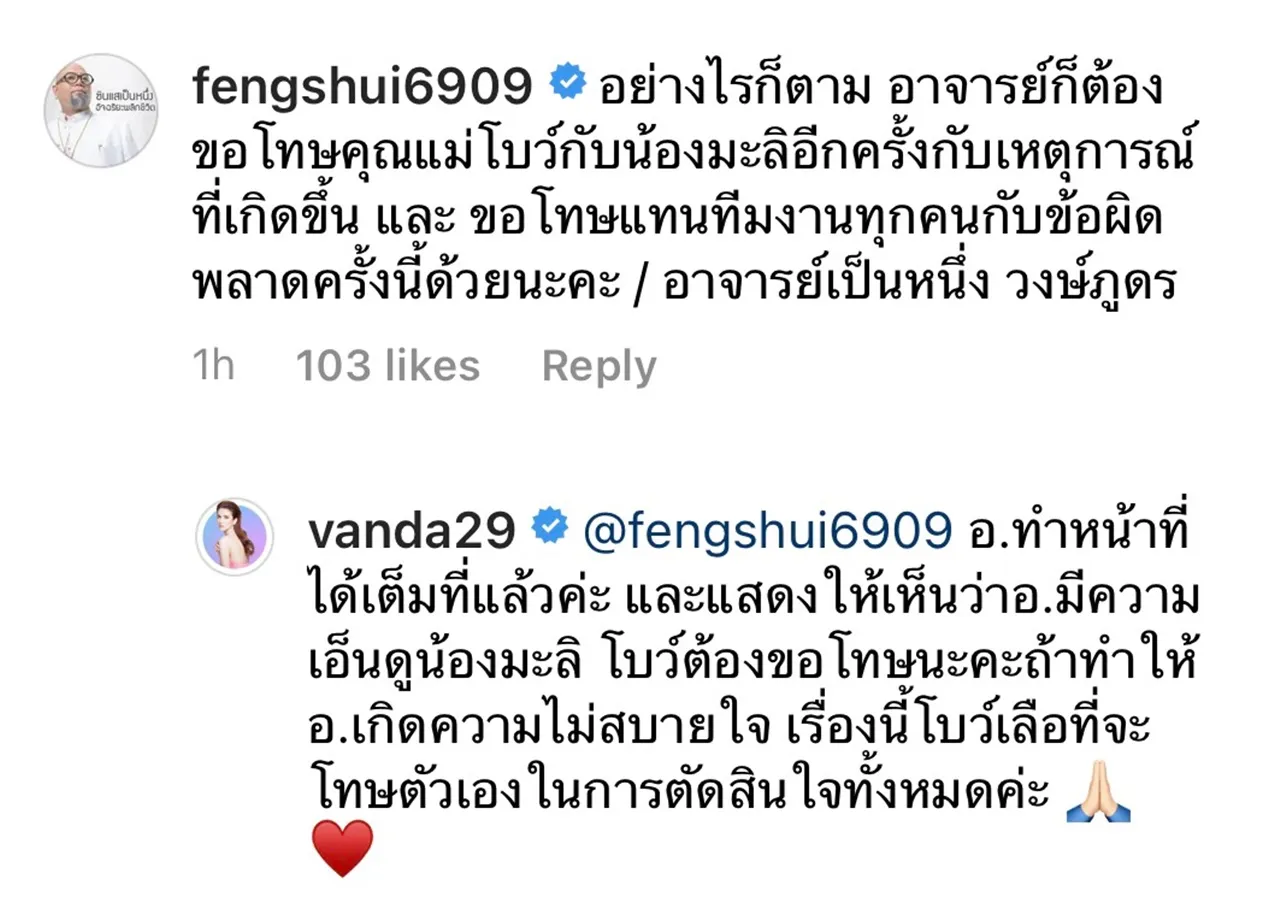 หลังจากที่ โบว์ แวนด้า สหวงษ์ ออกมาโพสต์อินสตาแกรมขอโทษลูกสาว น้องมะลิ ใจความว่า “วันนี้เป็นวันที่แม่ตัดสินใจพลาดในการรับงาน และรู้สึกผิดจริงๆ สิ่งสำคัญในการทำงาน คือ สัจจะ”