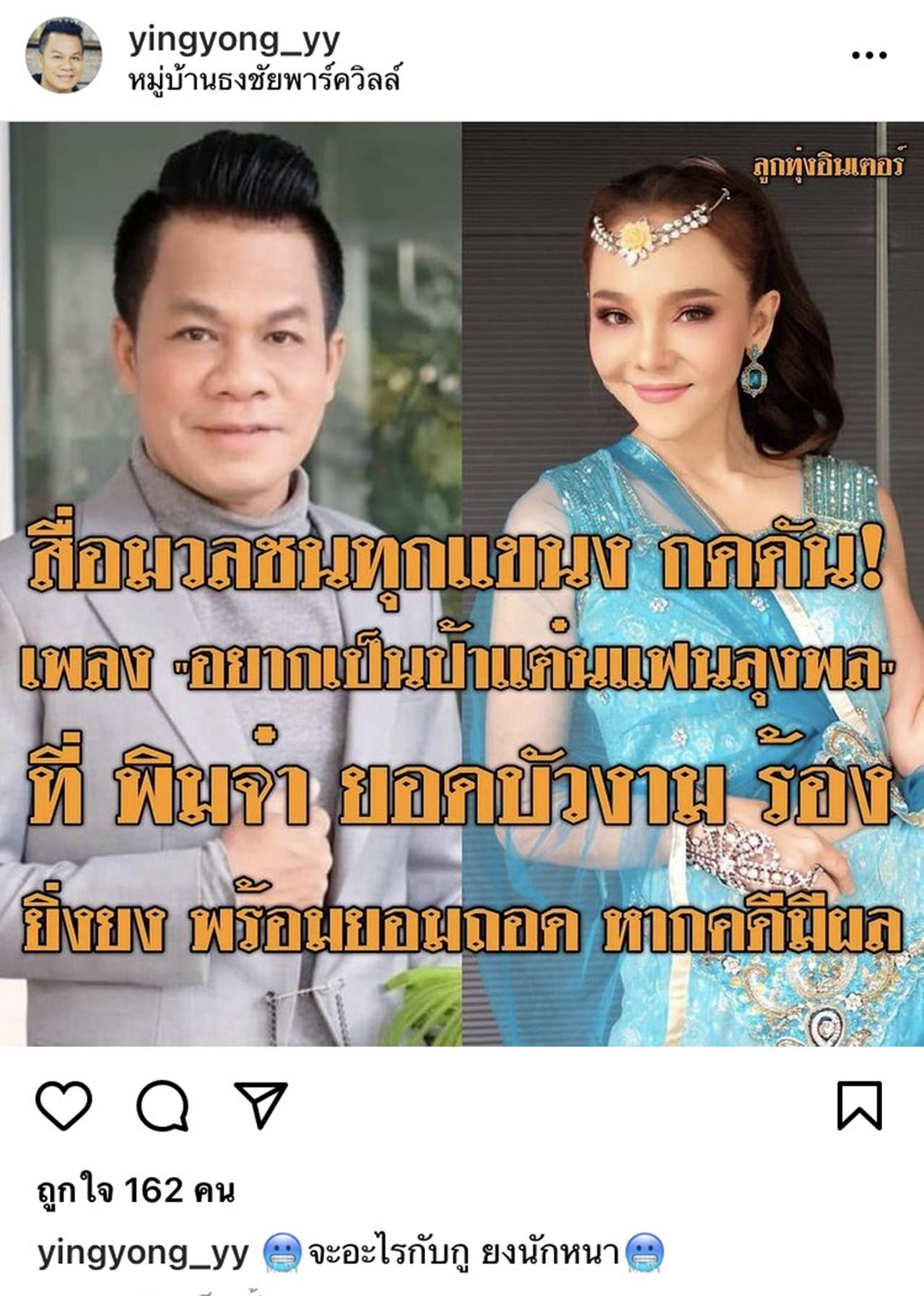 และ ยิ่งยง ก็ได้นำภาพข่าวที่ระบุว่า สื่อมวลชนทุกแขนง กดดัน! เพลง "อยากเป็นป้าแต๋นแฟนลุงพล" ที่ พิมจ๋า ยอดบัวงาม ร้อง ยิ่งยง พร้อมถอด หากคดีมีผล พร้อมกับเขียนแคปชั่นว่า "จะอะไรกับกู ยงนักหนา"