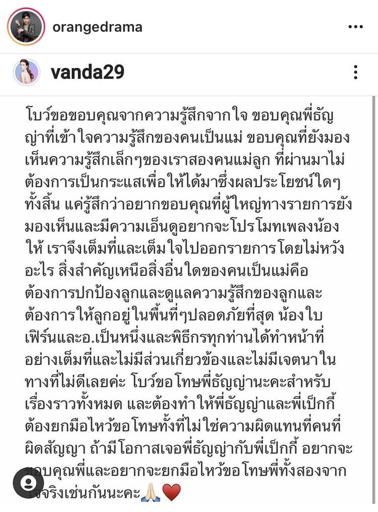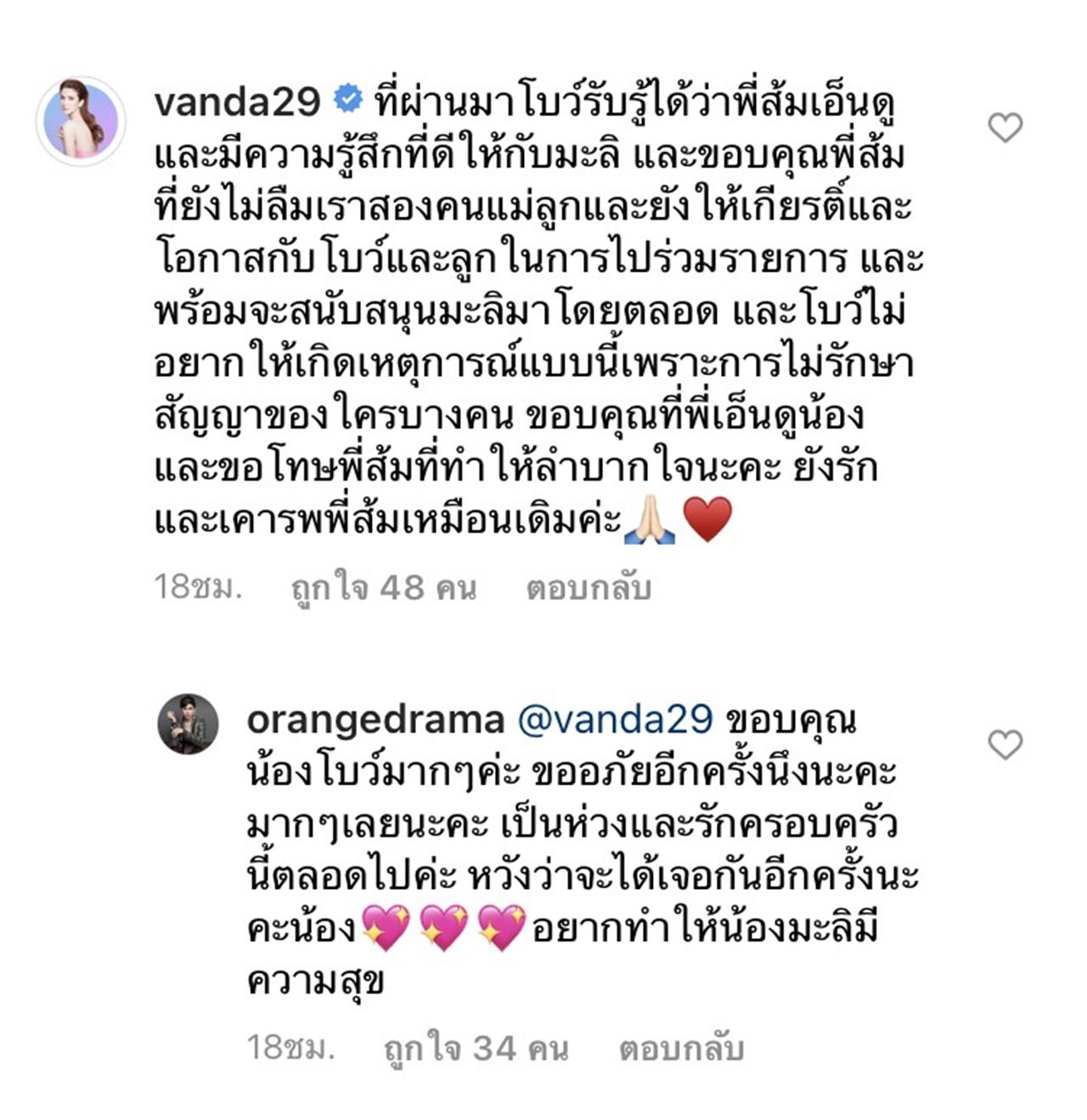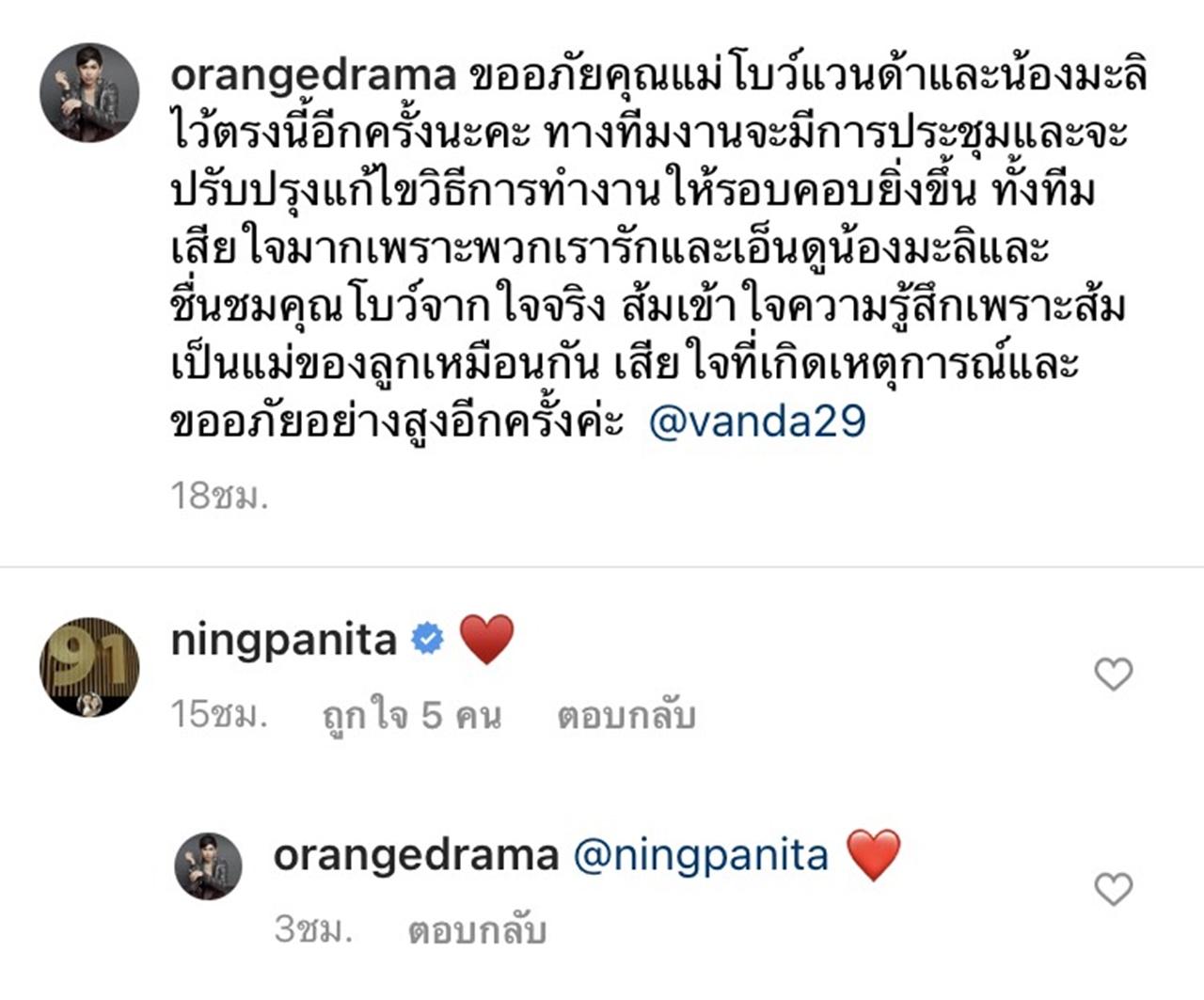 “ขออภัยคุณแม่โบว์แวนด้าและน้องมะลิไว้ตรงนี้อีกครั้งนะคะ ทางทีมงานจะมีการประชุมและจะปรับปรุงแก้ไขวิธีการทำงานให้รอบคอบยิ่งขึ้น ทั้งทีมเสียใจมากเพราะพวกเรารักและเอ็นดูน้องมะลิและชื่นชมคุณโบว์จากใจจริง ส้มเข้าใจความรู้สึกเพราะส้มเป็นแม่ของลูกเหมือนกัน เสียใจที่เกิดเหตุการณ์และขออภัยอย่างสูงอีกครั้งค่ะ @vanda29”