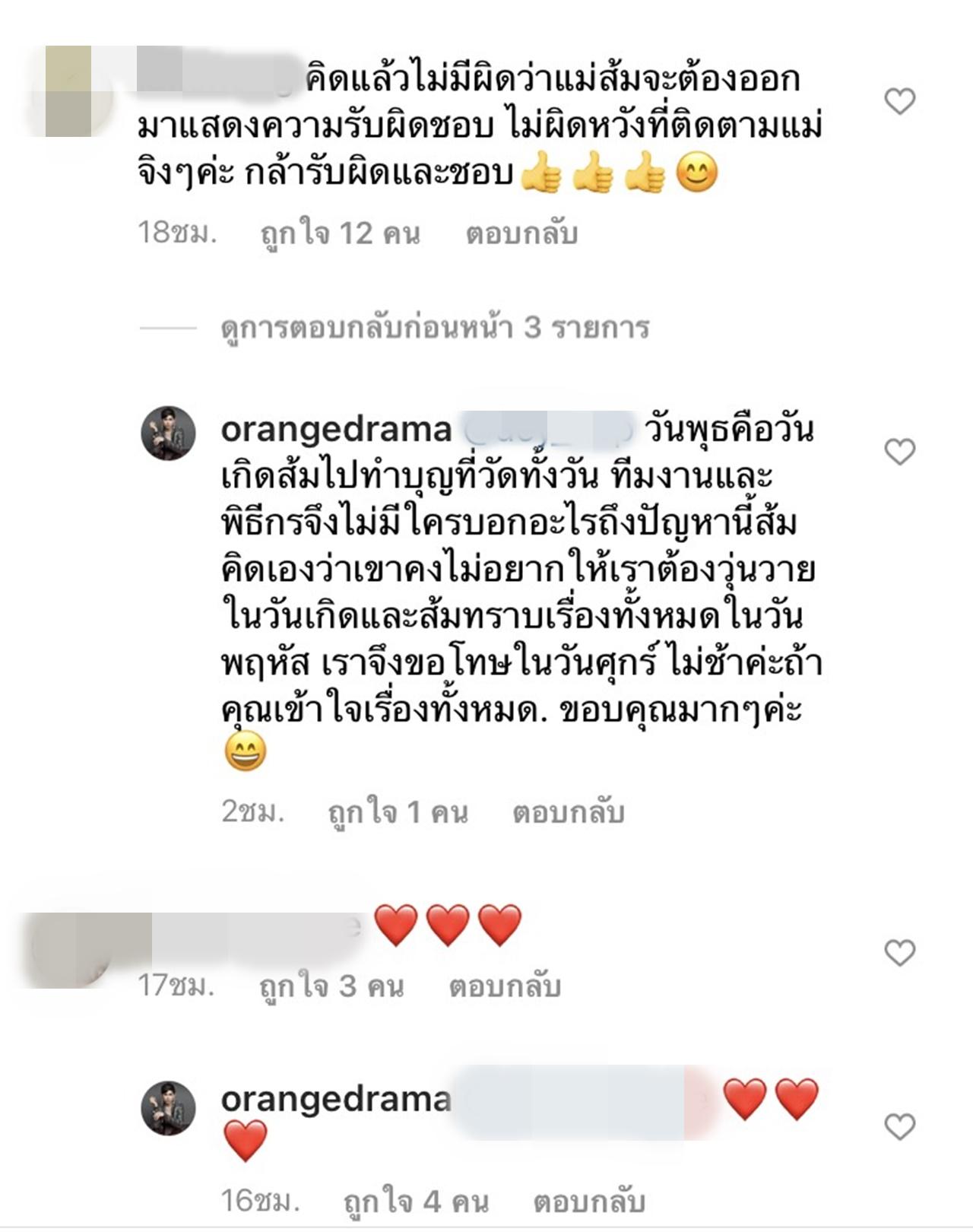 ทั้งนี้ก็ได้มีคนเข้ามาบอกว่า เรื่องเกิดวันพุธ แต่ทำไมถึงเพิ่งออกมาขอโทษ โดย ส้ม ก็ได้อธิบายเพิ่มว่า "วันพุธคือวันเกิดส้มไปทำบุญที่วัดทั้งวัน ทีมงานและพิธีกรจึงไม่มีใครบอกอะไรถึงปัญหานี้ส้มคิดเองว่าเขาคงไม่อยากให้เราต้องวุ่นวายในวันเกิดและส้มทราบเรื่องทั้งหมดในวันพฤหัส เราจึงขอโทษในวันศุกร์ ไม่ช้าค่ะถ้าคุณเข้าใจเรื่องทั้งหมด ขอบคุณมากๆค่ะ".