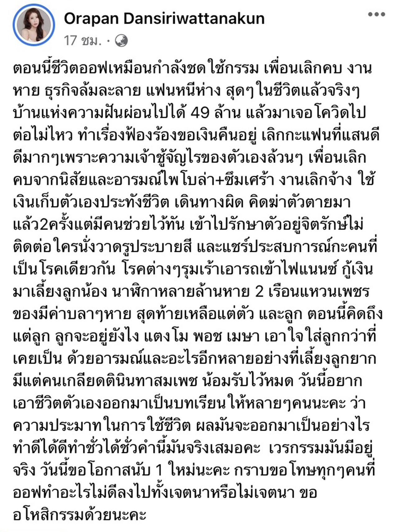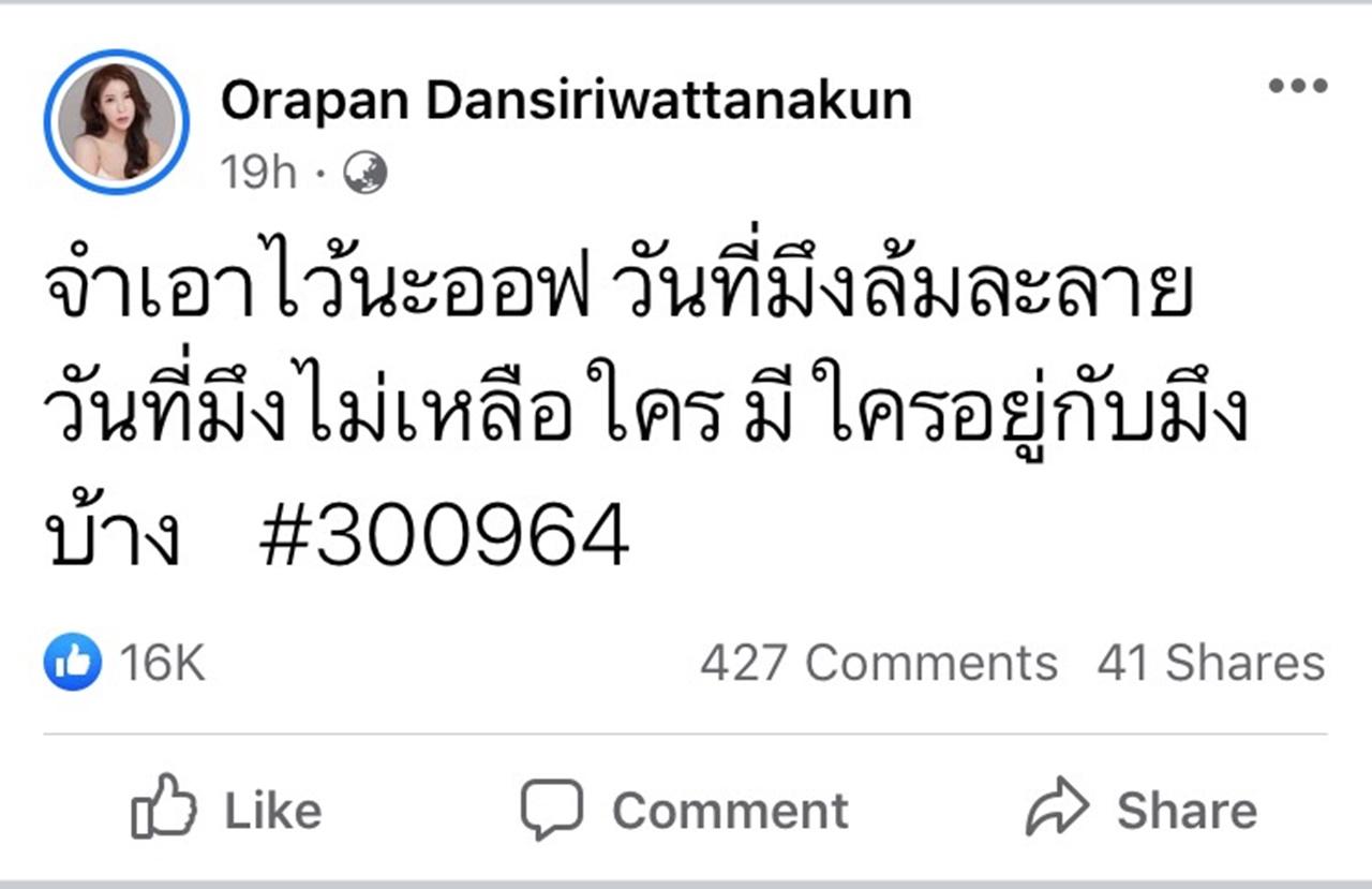 ล่าสุด ออฟฟี่ ได้ออกมาโพสต์ผ่านเฟซบุ๊ก Orapan Dansiriwattanakun พร้อมระบุข้อความสั้นๆ ว่า "จำเอาไว้นะออฟ วันที่มึงล้มละลาย วันที่มึงไม่เหลือใคร มีใครอยู่กับมึงบ้าง #300964" ซึ่งต่อมาเจ้าตัวก็ได้โพสต์ภาพสีดำ พร้อมข้อความที่เล่าถึงชีวิตตอนนี้ว่า