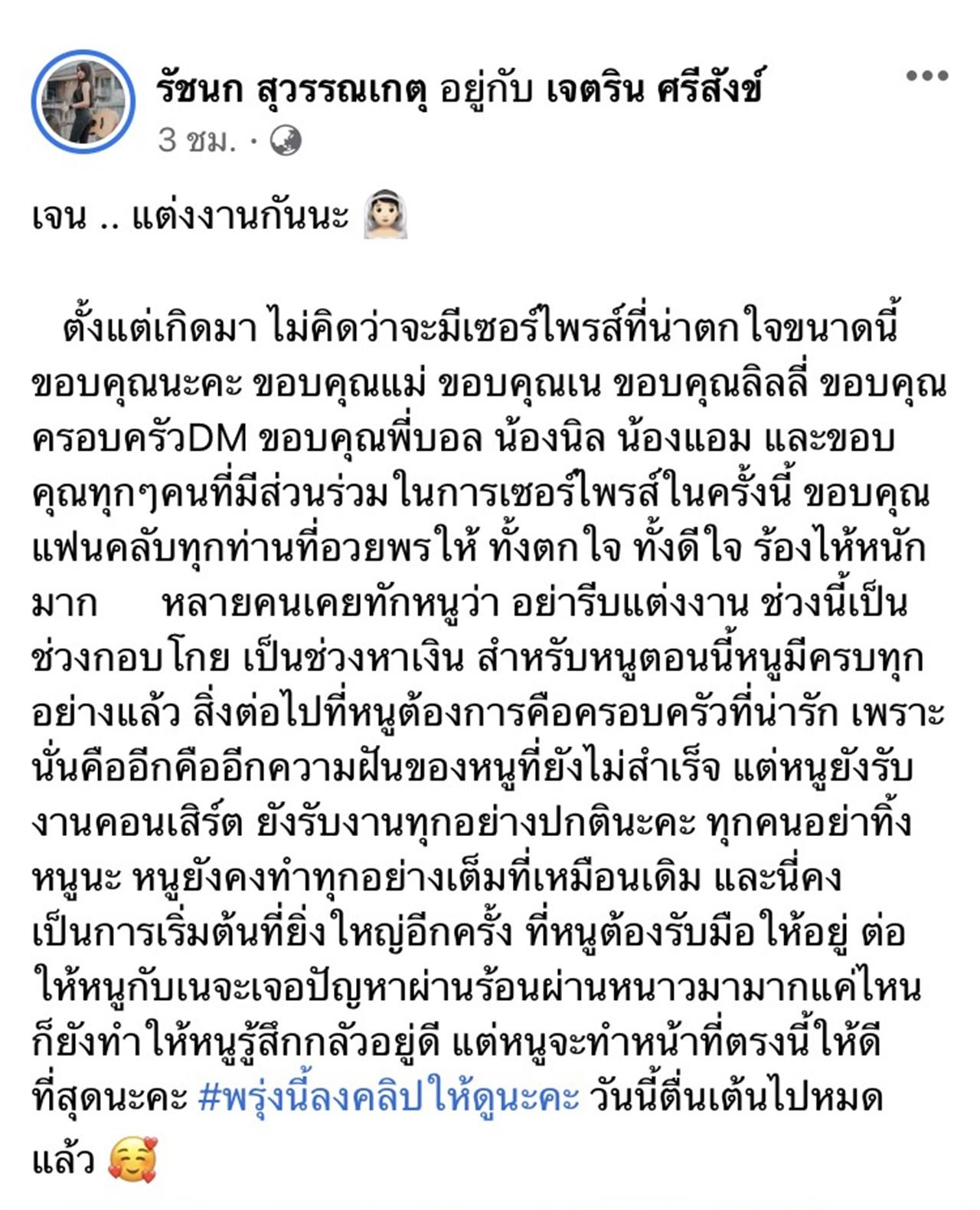 ยินดีด้วยๆ สละโสดไปแล้ว นักร้องสาว เจนนี่ ได้หมดถ้าสดชื่น หรือ เจนนี่ รัชนก สุวรรณเกตุ โดนแฟนที่คบหาดูใจกันมานาน เนเงิน เจตริน ศรีสังข์ ขอแต่งงานไปแล้ว กลางไลฟ์ Live คอนเสิร์ต