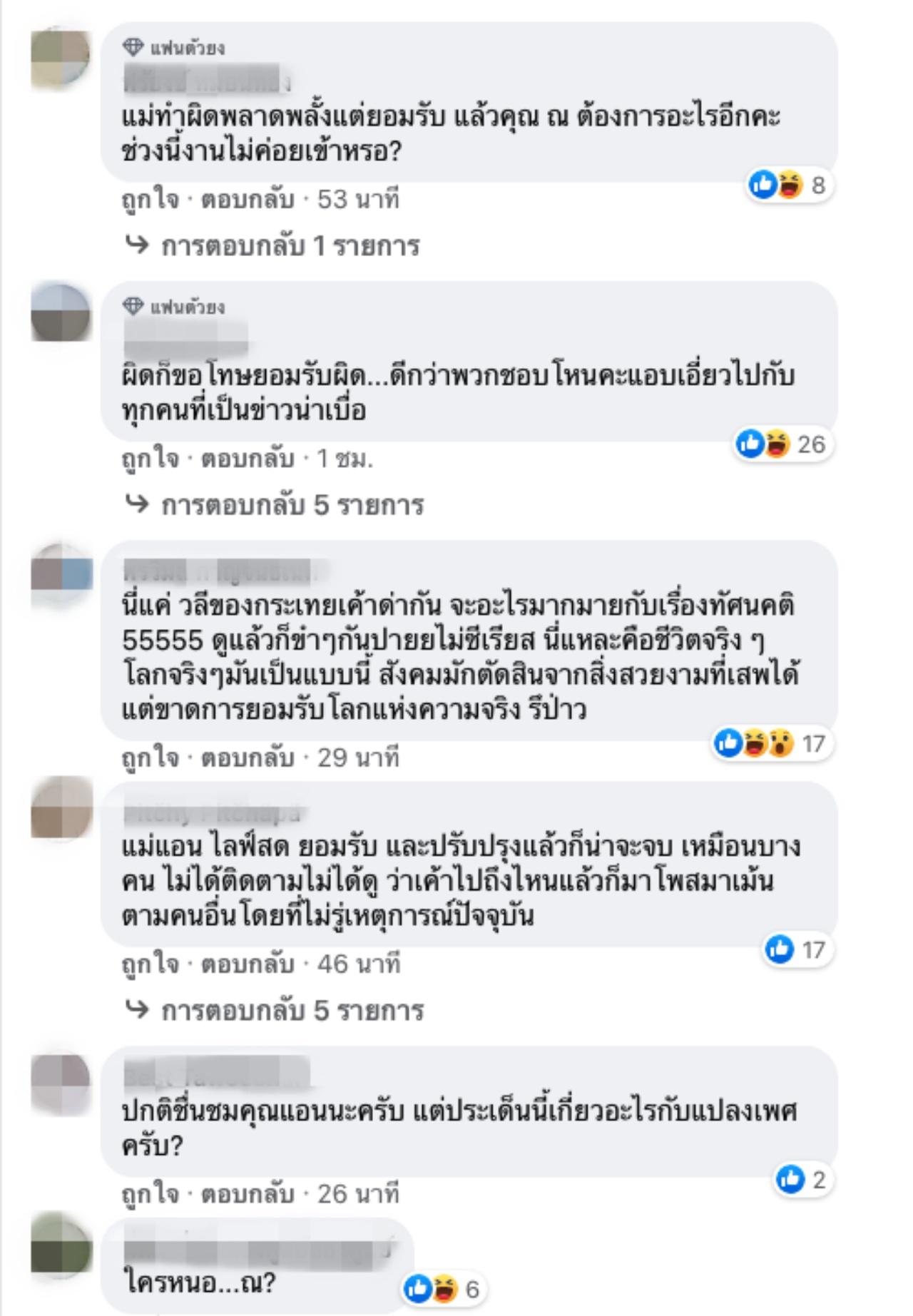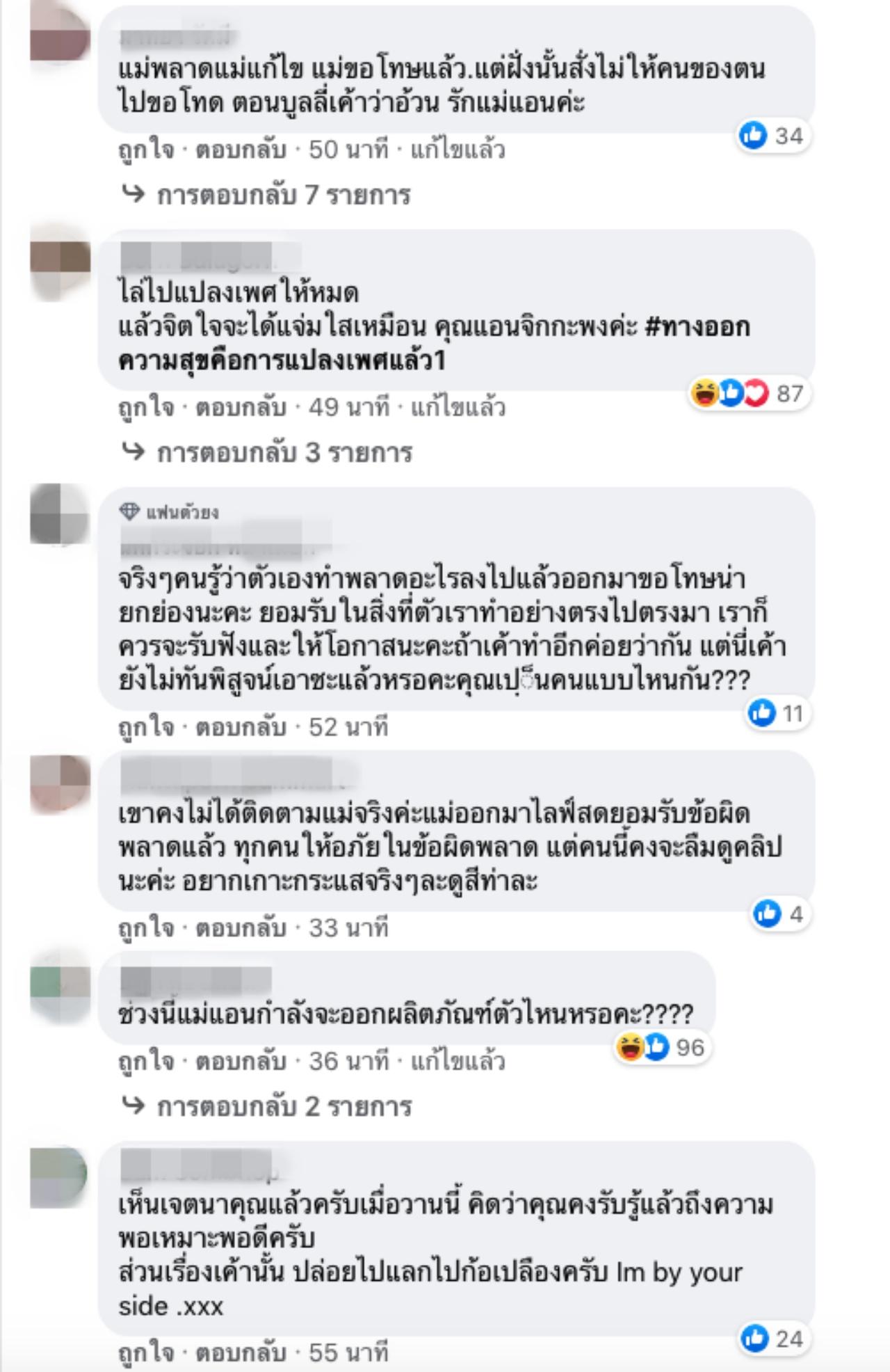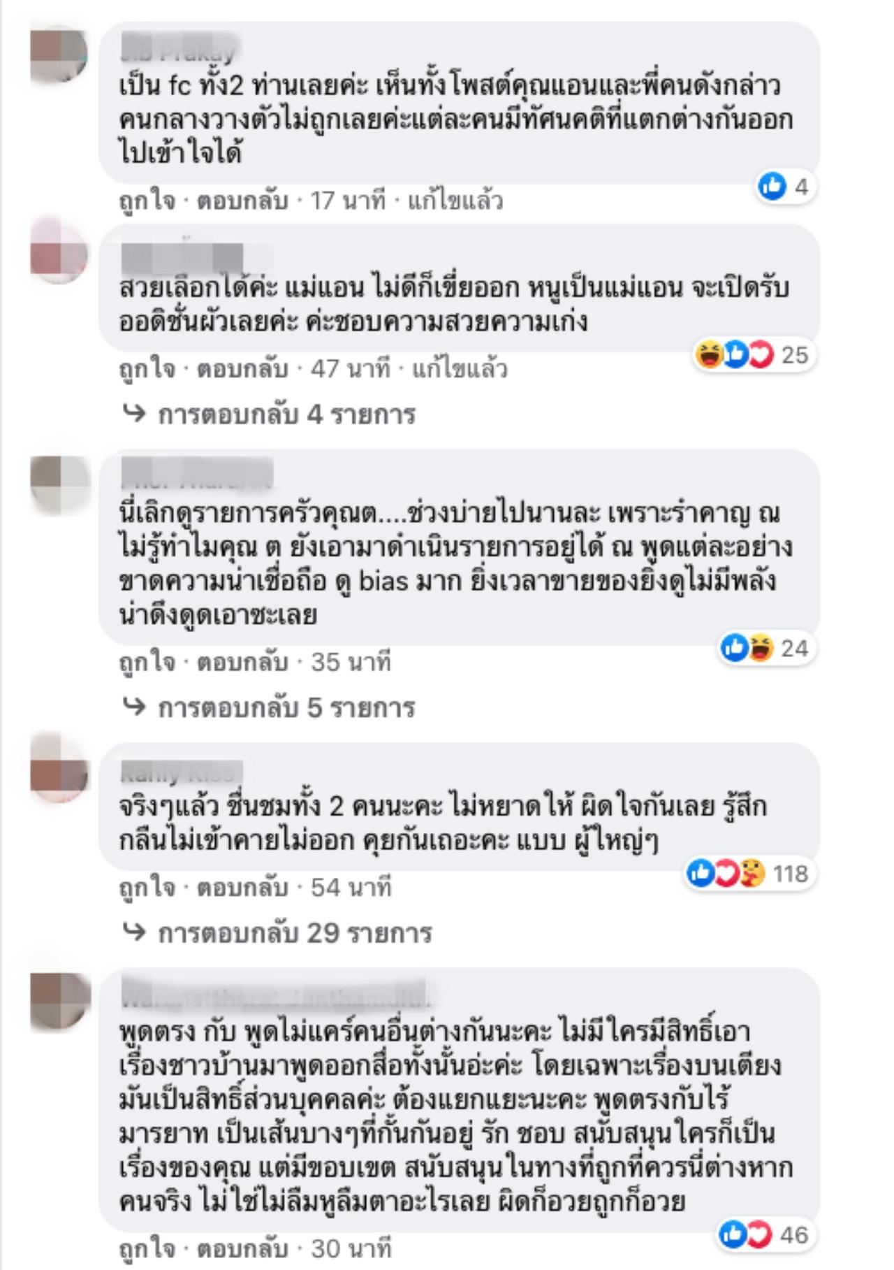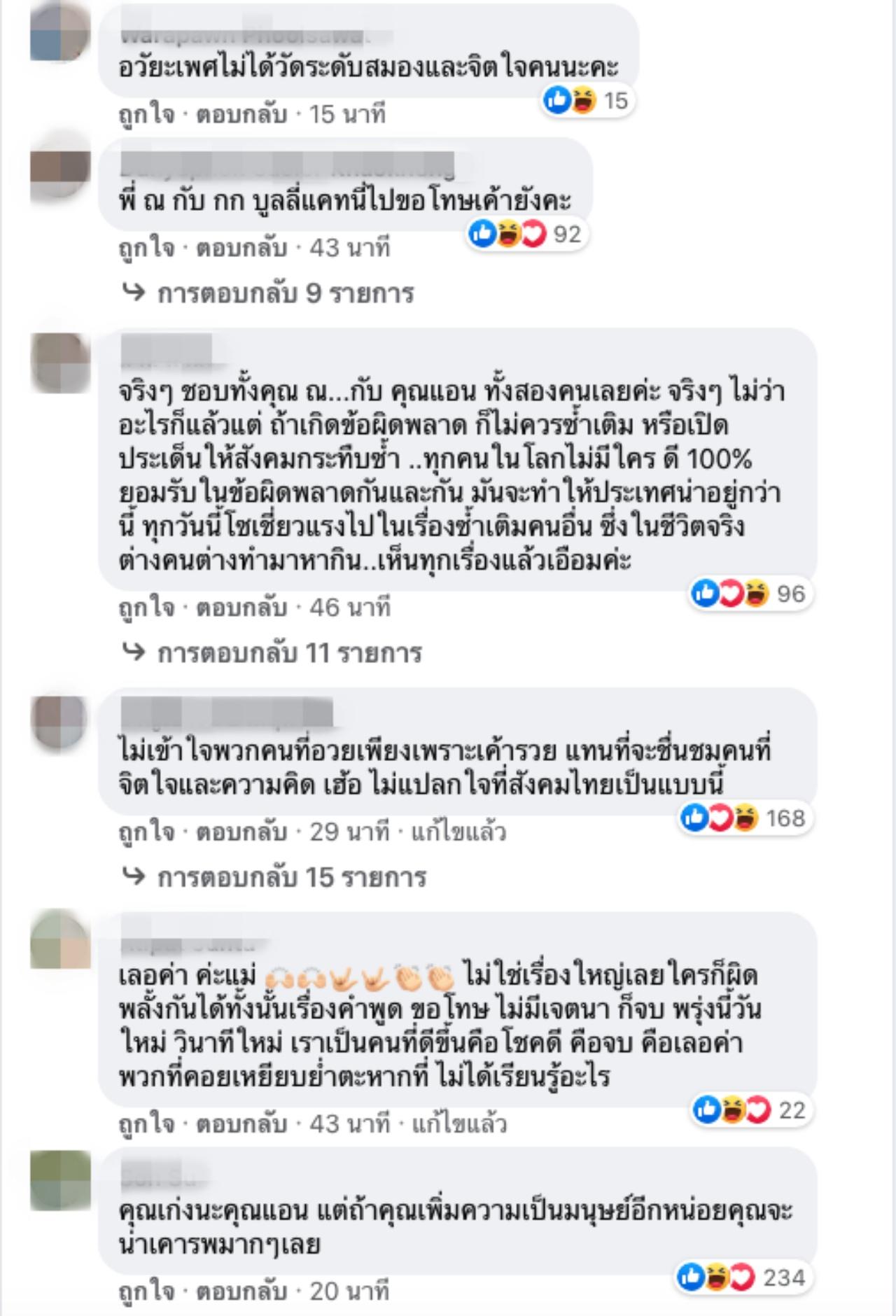 และบางส่วนก็เข้ามาให้กำลังใจ พร้อมกับบอกว่า "เข้าใจความรู้สึกของแม่แอนดี สิ่งที่ผิดพลาดไปก็ได้ขอโทษแล้ว แต่อีกฝ่ายไม่จบเอง" , "ตอนแรกยอมรับนะว่าไม่โอเค ตอนดูแม่ออกรายการ แต่พอดูแม่ไลสดเมื่อวานคือปรบมือ ผิดแล้วยอมรับ ไม่แถไปเลื่อย พูดมีเหตุผล #สวยรวยฉลาด" , "เป็น fc ทั้ง 2 ท่านเลยค่ะ เห็นทั้งโพสต์คุณแอนและพี่คนดังกล่าวคนกลางวางตัวไม่ถูกเลยค่ะ แต่ละคนมีทัศนคติที่แตกต่างกันออกไปเข้าใจได้".