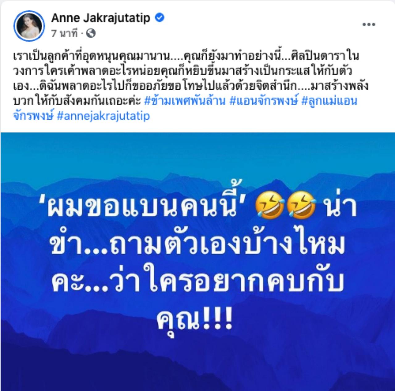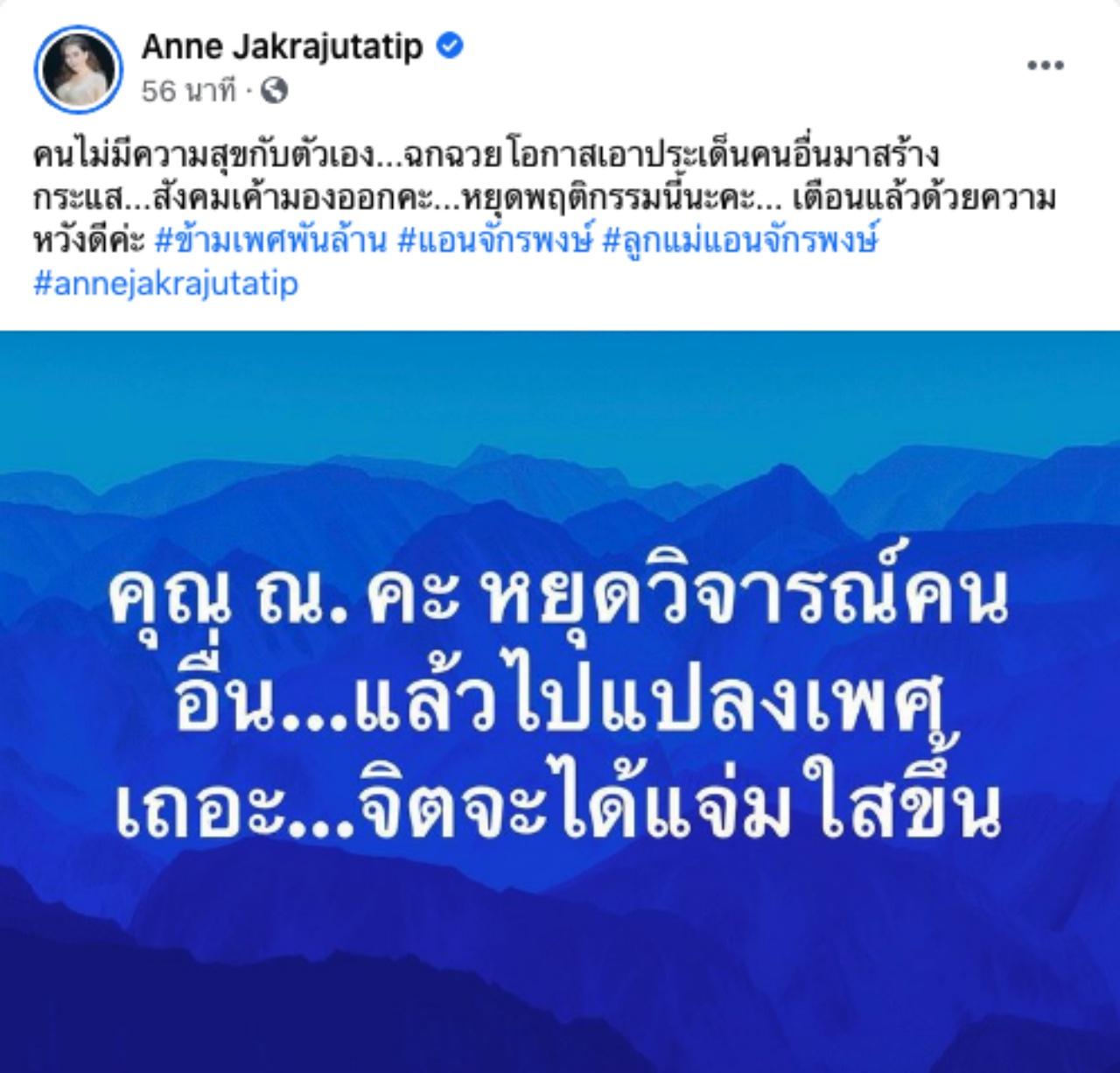 "คนไม่มีความสุขกับตัวเอง...ฉกฉวยโอกาสเอาประเด็นคนอื่นมาสร้างกระแส...สังคมเค้ามองออกคะ...หยุดพฤติกรรมนี้นะคะ... เตือนแล้วด้วยความหวังดีค่ะ #ข้ามเพศพันล้าน #แอนจักรพงษ์ #ลูกแม่แอนจักรพงษ์ #annejakrajutatip"