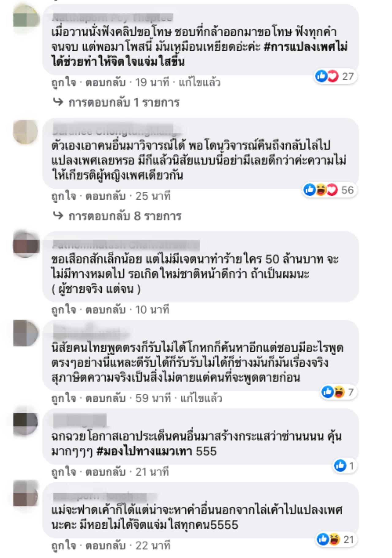 งานนี้ทำเอาชาวเน็ตเข้ามาคอมเมนต์กันสนั่นหวั่นไหว พร้อมกับวิจารณ์ว่า "การที่ แอน ออกมาโพสต์แบบนี้ไม่ดีเลย เพราะการแปลงเพศไม่ได้วัดที่สมองและระดับจิตใจคน ถ้าจะฟาดใครก็ไม่ควรไล่ให้เค้าไปแปลงเพศ" , "ตัวเองเอาคนอื่นมาวิจารณ์ได้ พอโดนวิจารณ์คืนถึงกลับไล่ไปแปลงเพศเลยหรอ แปลงเพศแล้วนิสัยแบบนี้อย่ามีเลยดีกว่าค่ะ ความไม่ให้เกียรติผู้หญิงเพศเดียวกัน" , "เมื่อวานนั่งฟังคลิปขอโทษ ชอบที่กล้าออกมาขอโทษ ฟังทุกคำ จนจบ แต่พอมาโพสนี้ มันเหมือนเหยียดอ่ะค่ะ #การแปลงเพศไม่ได้ช่วยทำให้จิตใจแจ่มใสขึ้น"