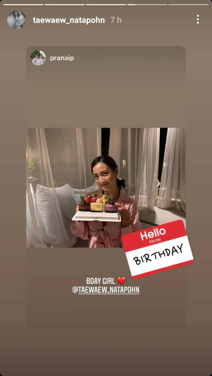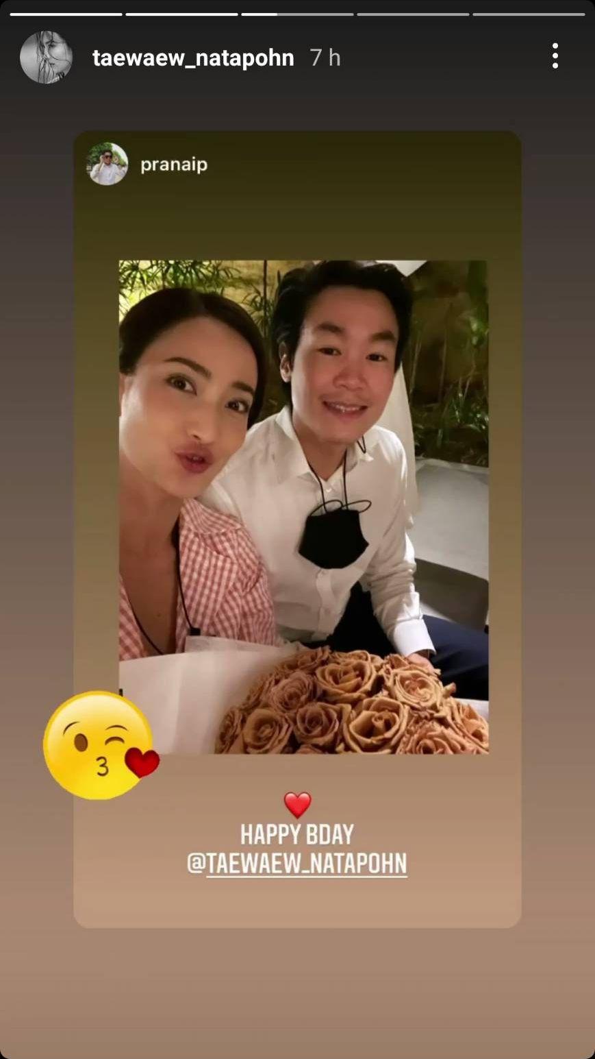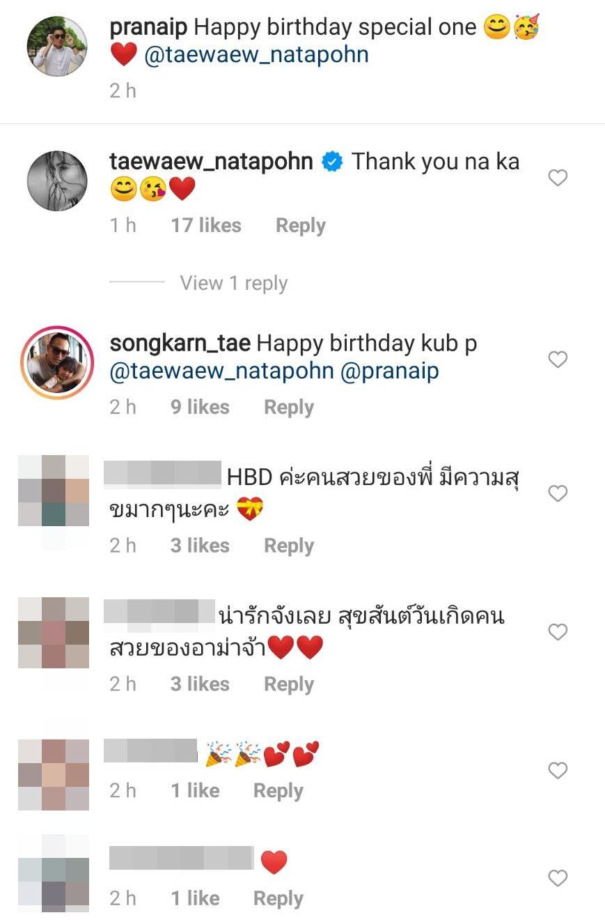 ด้าน ไฮโซณัย ก็ได้โพสต์ภาพคู่กับแต้วเมื่อตอนไปเที่ยว จ.เชียงใหม่ พร้อมทั้งเขียนข้อความอวยพรว่า “Happy birthday special one @taewaew_natapohn” โดยไฮโซหนุ่ม สงกรานต์ เตชะณรงค์ และแฟนๆ เข้ามาร่วมอวยพรวันเกิดให้แต้ว ส่วนแต้วก็ได้ตอบกลับว่า “Thank you na ka” และใสอีโมจิทำหน้าน่ารักๆ รวมถึงอีโมจิหัวใจด้วย.