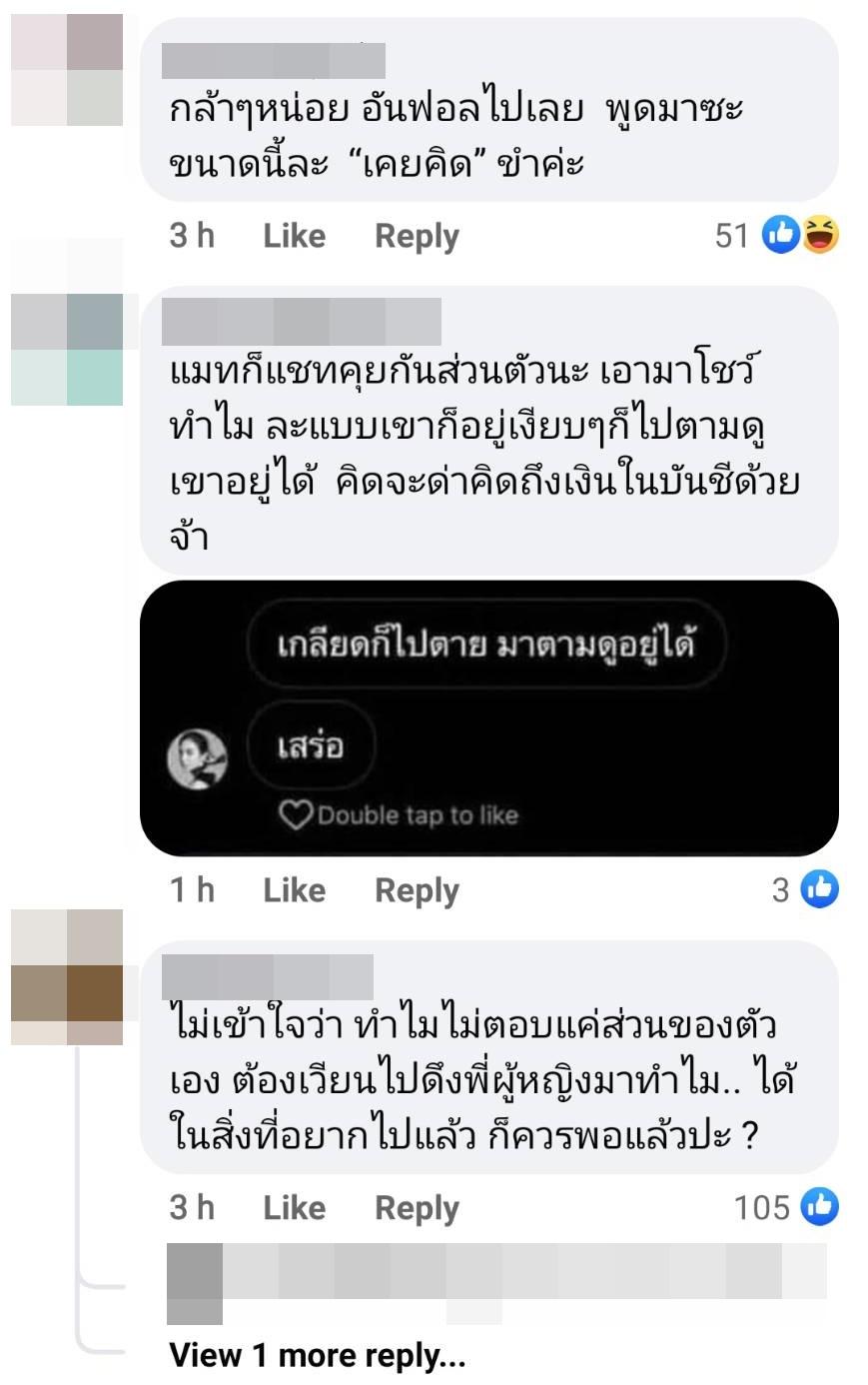 แต่งานนี้เพจบันเทิงดัง เจ๊มอย 108 ก็ได้เอามาลงในเพจ ซึ่งชาวเน็ตต่างโฟกัสไปที่ประโยคสุดท้ายในแชตของแมทที่เขียนว่า “ดีนะ เคยคิดจะอันฟอลพี่ผู้หญิงด้วย” พร้อมทั้งแสดงความคิดเห็นเป็นจำนวนมาก อาทิ แมทก็แชตคุยกันส่วนตัวนะ เอามาโชว์ทำไม, ไม่เข้าใจว่า ทำไมไม่ตอบแค่ส่วนของตัวเอง ต้องเวียนไปดึงพี่ผู้หญิงมาทำไม.., พี่ผู้หญิงนี้คิดเป็นใครอื่นไม่ได้เลย ฯลฯ