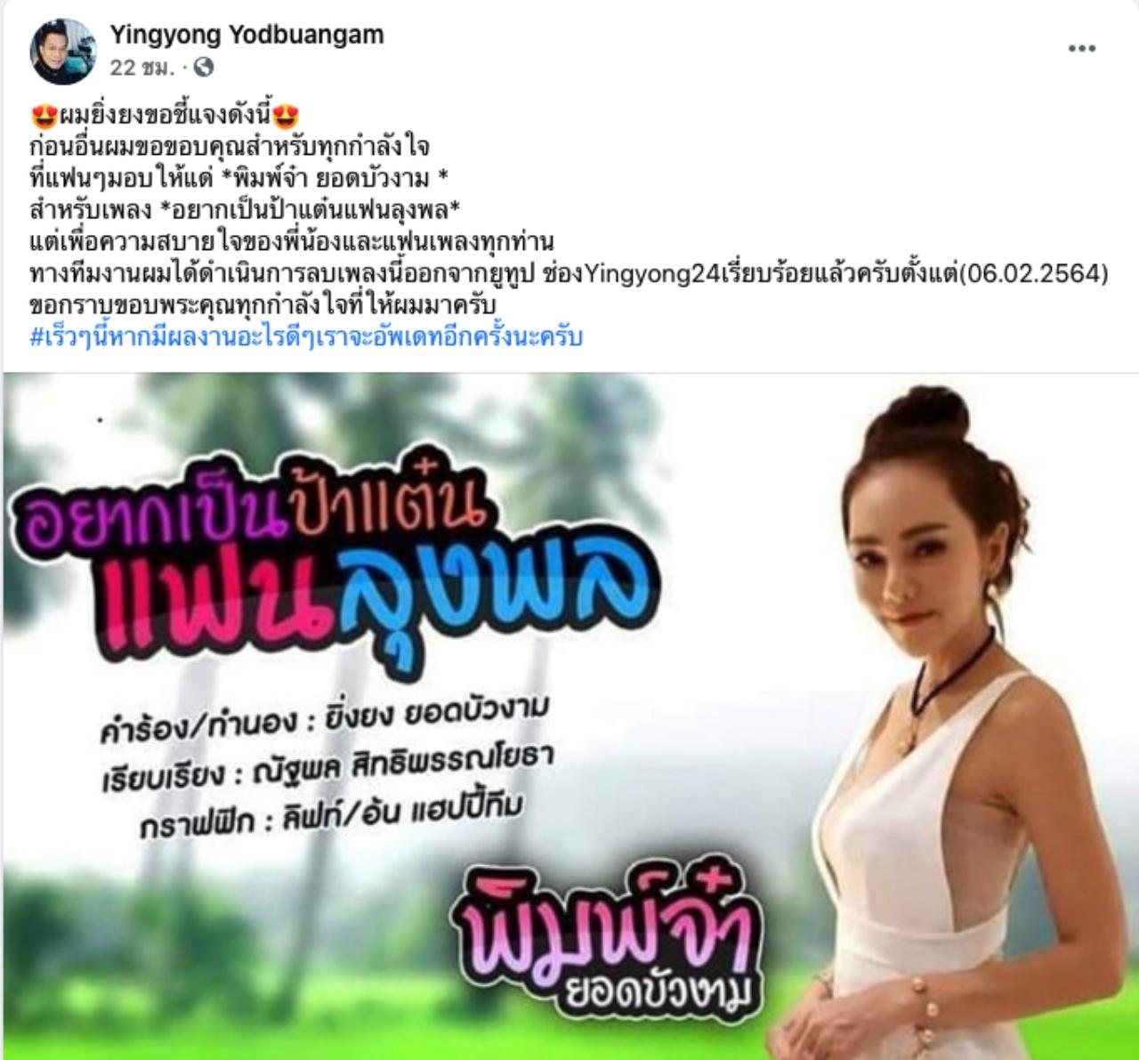แต่เพื่อความสบายใจของพี่น้องและแฟนเพลงทุกท่าน ทางทีมงานผมได้ดำเนินการลบเพลงนี้ออกจากยูทูบ ช่องYingyong24เรียบร้อยแล้วครับตั้งแต่(06.02.2564) ขอกราบขอบพระคุณทุกกำลังใจที่ให้ผมมาครับ #เร็วๆนี้หากมีผลงานอะไรดีๆเราจะอัพเดทอีกครั้งนะครับ".