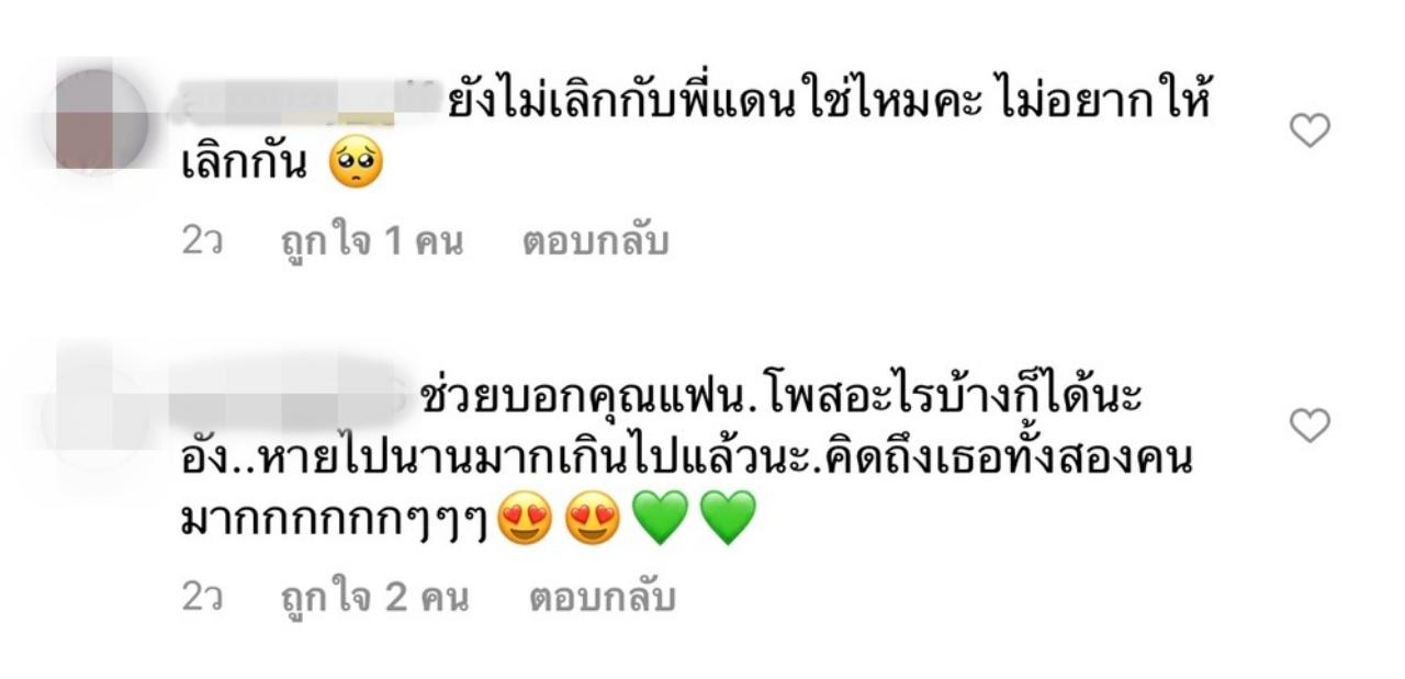 แต่หลายคนก็คอมเมนต์ถามหา แดน กันแบบรัวๆ ว่าหายไปไหน, ยังไม่เลิกกับพี่แดนใช่ไหมคะไม่อยากให้เลิกกัน, ช่วยบอกคุณแฟน.โพสอะไรบ้างก็ได้นะอัง..หายไปนานมากเกินไปแล้วนะ.คิดถึงเธอทั้งสองคนมากกกกกกๆๆๆ, คิดถึงแดนแพทตี้จัง, รอรูปคู่สยบข่าวลือ เป็นต้น แต่ แพทตี้ ก็ยังไม่ได้มีการตอบกลับแต่อย่างใด.