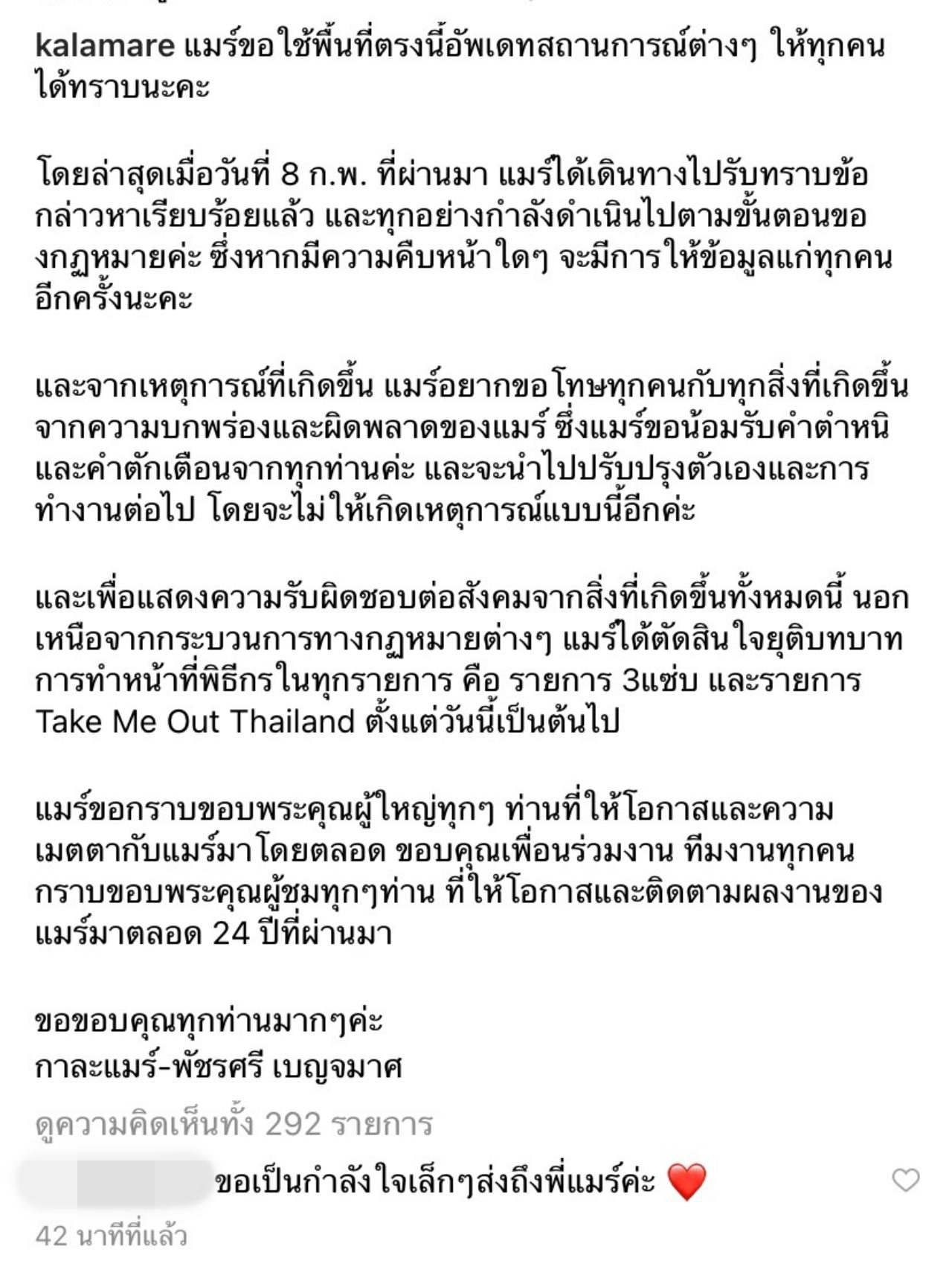 "แมร์ขอใช้พื้นที่ตรงนี้อัปเดตสถานการณ์ต่างๆ ให้ทุกคนได้ทราบนะคะ โดยล่าสุดเมื่อวันที่ 8 ก.พ. ที่ผ่านมา แมร์ได้เดินทางไปรับทราบข้อกล่าวหาเรียบร้อยแล้ว และทุกอย่างกำลังดำเนินไปตามขั้นตอนของกฎหมายค่ะ ซึ่งหากมีความคืบหน้าใดๆ จะมีการให้ข้อมูลแก่ทุกคนอีกครั้งนะคะ และจากเหตุการณ์ที่เกิดขึ้น