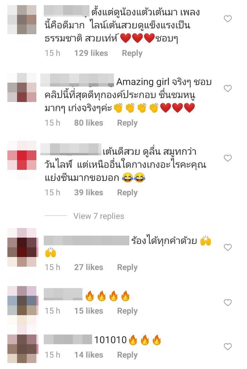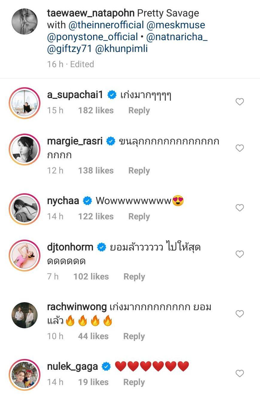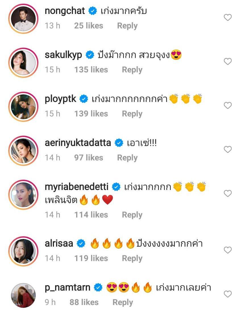 รวมไปถึงคนในวงการบันเทิงที่คอมเมนต์ชื่นชมความสามารถของแต้วหลายคน อาทิ มาร์กี้ ราศรี “ขนลุกกกกกกกกกกกกกกกกก”, ณิชา ณัฏฐณิชา “Wowwwwwwww”, เอ ศุภชัย “เก่งมากๆๆๆๆ”, ต้นหอม ศกุนตลา “ยอมล้าววววว ไปให้สุดดดดดดด”, ก้อย รัชวิน “เก่งมากกกกกกกกก ยอมแล้ว” ฯลฯ