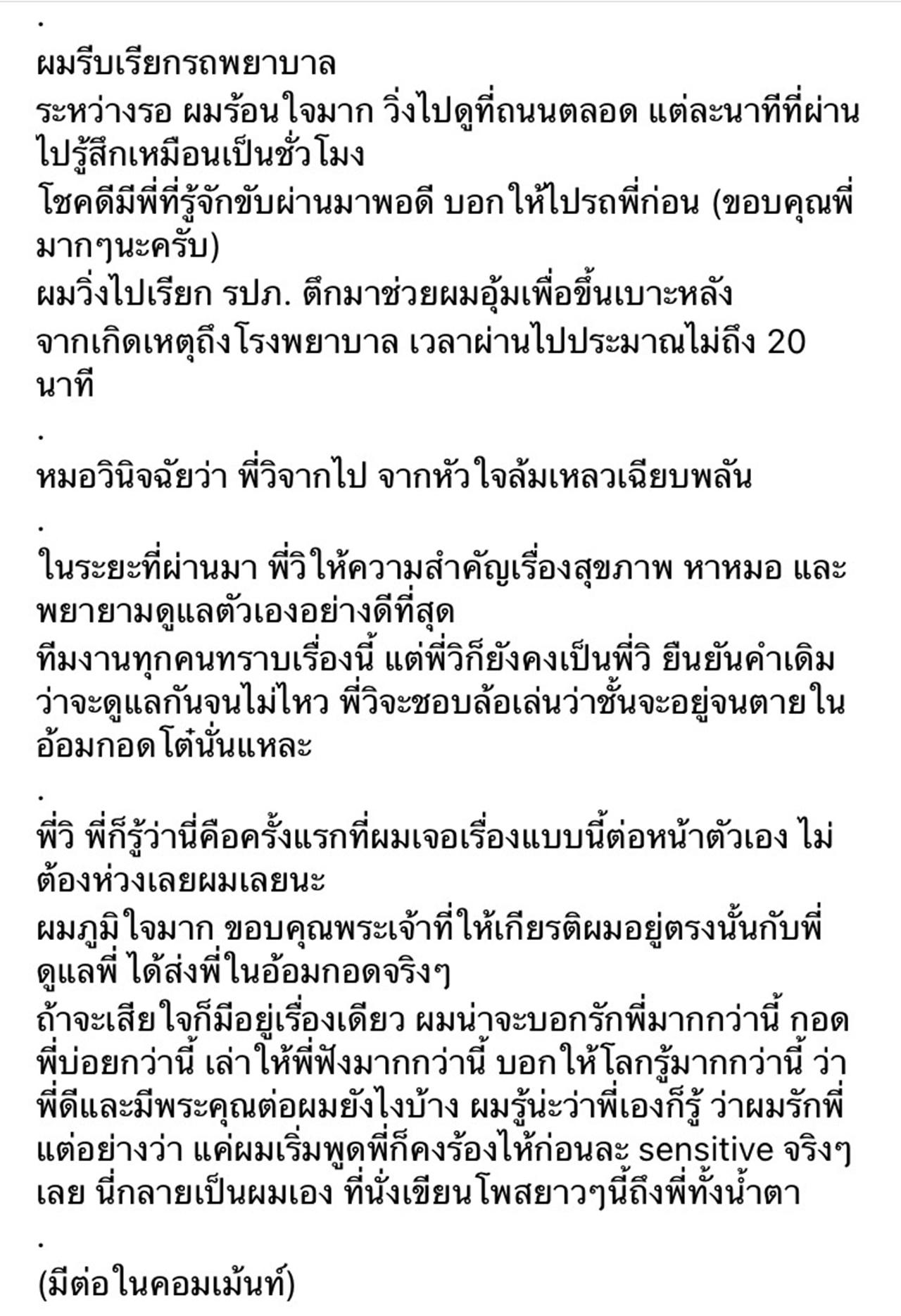 พี่วิ พี่ก็รู้ว่านี่คือครั้งแรกที่ผมเจอเรื่องแบบนี้ต่อหน้าตัวเอง ไม่ต้องห่วงเลยผมเลยนะ ผมภูมิใจมาก ขอบคุณพระเจ้าที่ให้เกียรติผมอยู่ตรงนั้นกับพี่ ดูแลพี่ ได้ส่งพี่ในอ้อมกอดจริงๆ