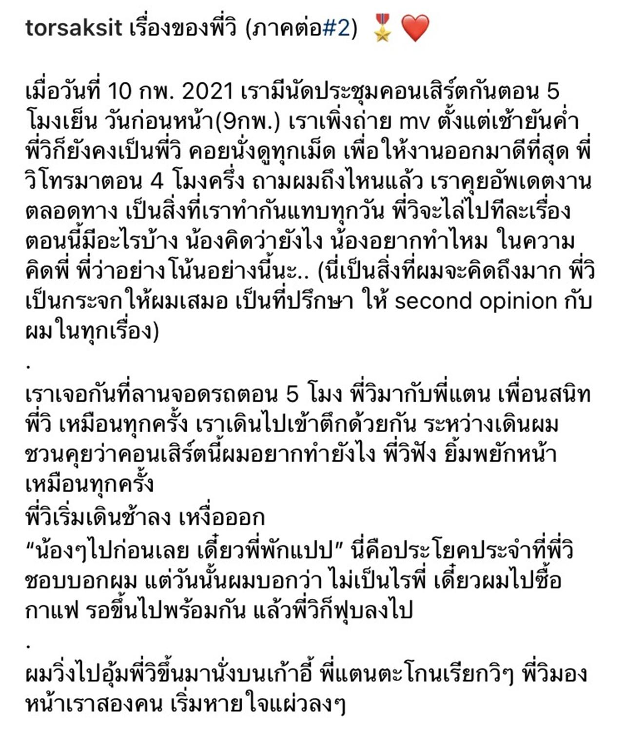 เมื่อวันที่ 10 กพ. 2021 เรามีนัดประชุมคอนเสิร์ตกันตอน 5 โมงเย็น วันก่อนหน้า(9กพ.) เราเพิ่งถ่าย mv ตั้งแต่เช้ายันค่ำ พี่วิก็ยังคงเป็นพี่วิ คอยนั่งดูทุกเม็ด เพื่อให้งานออกมาดีที่สุด พี่วิโทรมาตอน 4 โมงครึ่ง ถามผมถึงไหนแล้ว