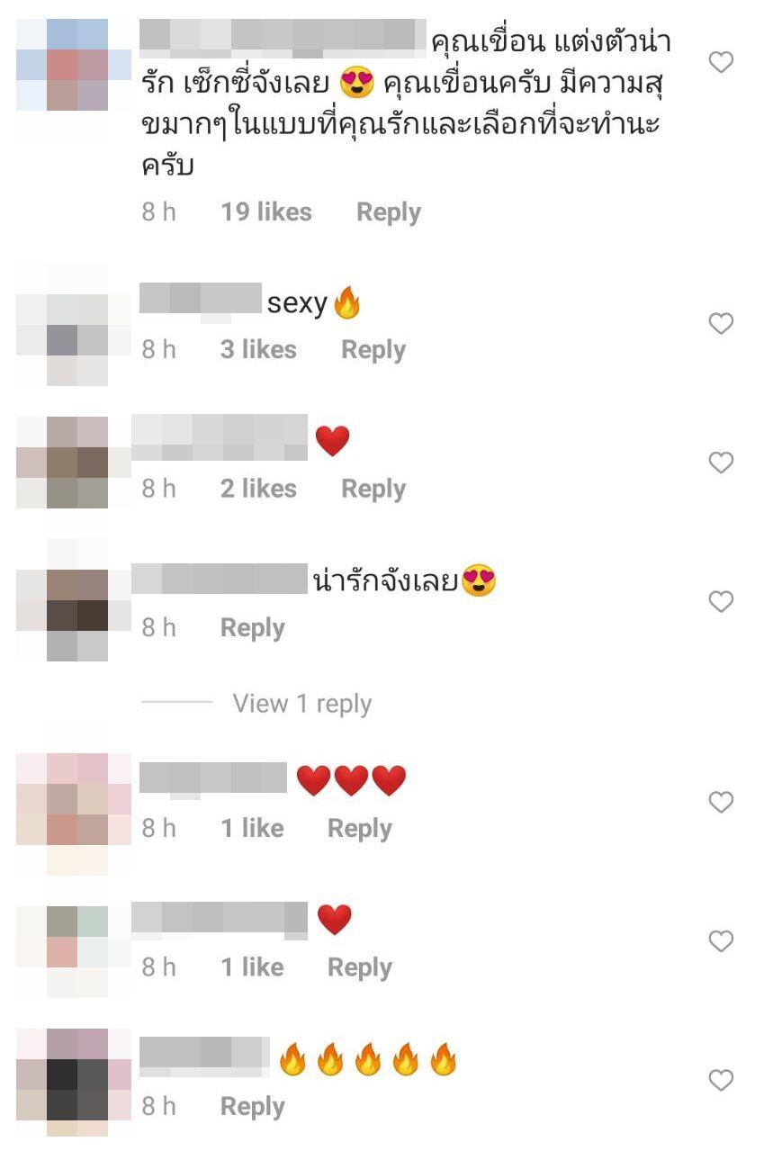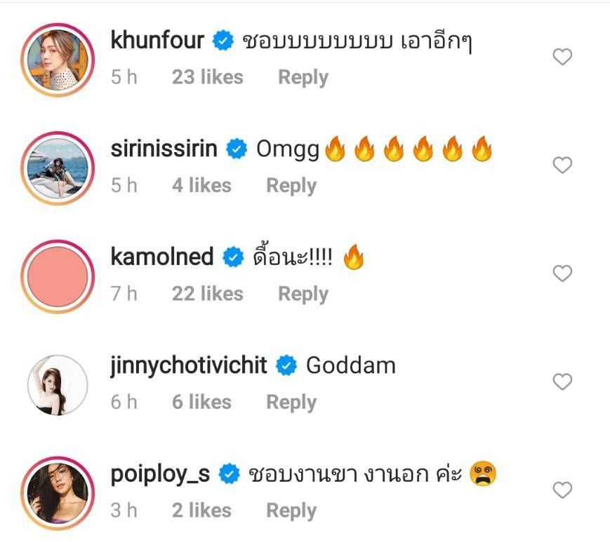 งานนี้ทำเอาแฟนๆ ต่างคอมเมนต์ชื่นชมว่าแต่งตัวน่ารัก เซ็กซี่ แซ่บมาก เต็ม 10 ไม่หักเลยจ้า ส่วนคนในวงการบันเทิงก็เข้ามาคอมเมนต์หลายคน อาทิ โฟร์ ศกลรัตน์ “ชอบบบบบบบบ เอาอีกๆ” ชิปปี้ ศิรินทร์ “Omgg” และใส่อีโมจิไฟลุก, อาย กมลเนตร “ดื้อนะ!!!!” ฯลฯ