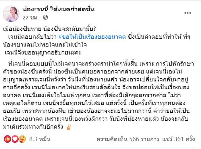 ล่าสุด เจนนี่ ได้หมดถ้าสดชื่น ก็ได้ออกมาชี้แจงถึงเรื่องนี้ผ่านไลฟ์สดเพจน้องเจนนี่ ได้หมดถ้าสดชื่น ว่า แชตที่ออกมาในข่าว ความจริงไม่ใช่แชตหลุด ซึ่งตนรู้อยู่แล้วว่าต้องออกสู่สาธารณะ และแชตนี้เป็นแชตที่ตนเตือนสติน้องๆ ในค่ายเท่านั้น เพราะบางคนติดแฟน ติดเกม จนไม่ขยัน ไม่สนใจงาน แต่ยืนยันว่าไม่ได้ไล่ใครออก และไม่เคยคิดจะไล่ใคร เพราะสงสารเด็ก