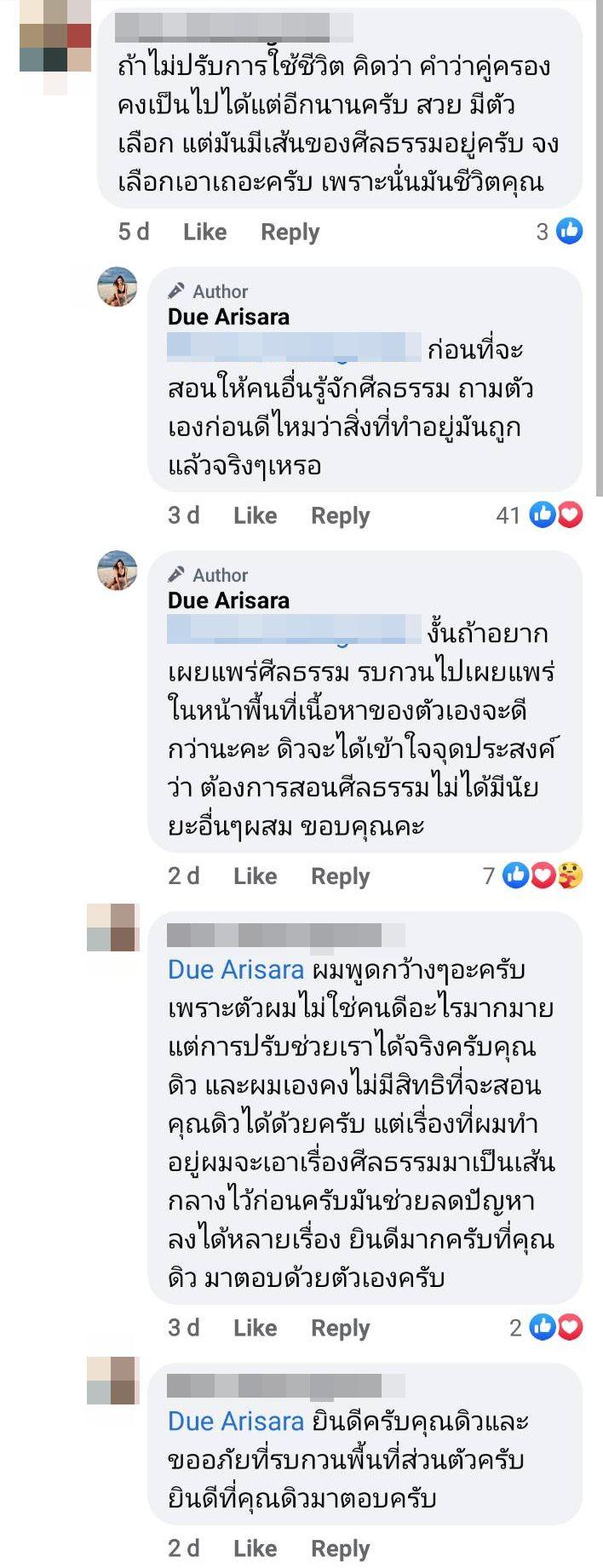 แต่ชาวเน็ตคนนี้ก็ชี้แจงต่อว่า “ผมพูดกว้างๆ อะครับ เพราะตัวผมไม่ใช่คนดีอะไรมากมาย แต่การปรับช่วยเราได้จริงครับคุณดิว และผมเองคงไม่มีสิทธิที่จะสอนคุณดิวได้ด้วยครับ แต่เรื่องที่ผมทำอยู่ ผมจะเอาเรื่องศีลธรรมมาเป็นเส้นกลางไว้ก่อนครับ มันช่วยลดปัญหาลงได้หลายเรื่อง ยินดีมากครับที่คุณดิว มาตอบด้วยตัวเองครับ” ก่อนที่ดิวจะตอบกลับว่า “งั้นถ้าอยากเผยแพร่ศีลธรรม รบกวนไปเผยแพร่ในหน้าพื้นที่เนื้อหาของตัวเองจะดีกว่านะคะ ดิวจะได้เข้าใจจุดประสงค์ว่า ต้องการสอนศีลธรรมไม่ได้มีนัยอื่นๆ ผสม ขอบคุณค่ะ”.