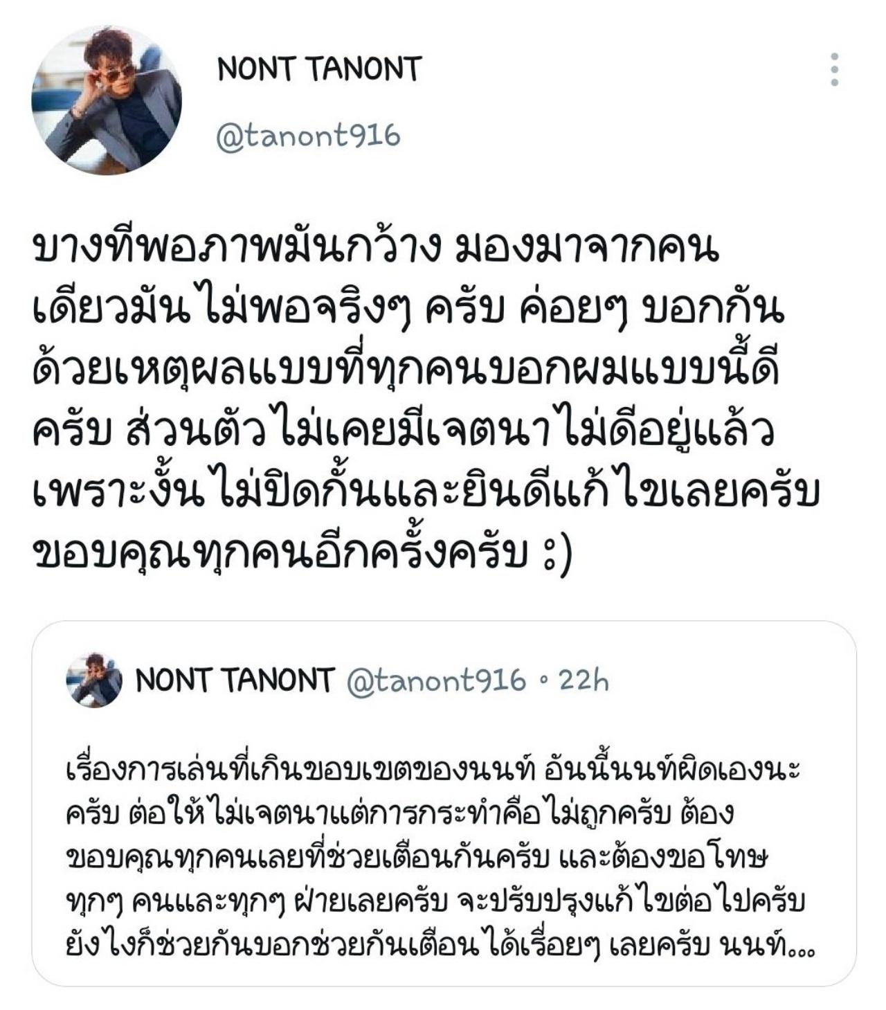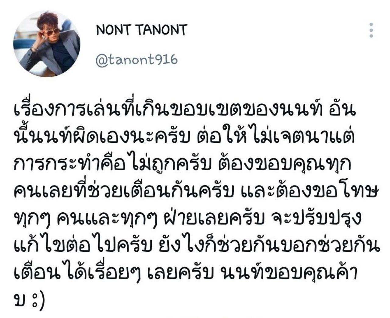 “เรื่องการเล่นที่เกินขอบเขตของนนท์ อันนี้นนท์ผิดเองนะครับ ต่อให้ไม่เจตนา แต่การกระทำคือไม่ถูกครับ ต้องขอบคุณทุกคนเลยที่ช่วยเตือนกันครับ และต้องขอโทษทุกๆ คนและทุกๆ ฝ่ายเลยครับ จะปรับปรุงแก้ไขต่อไปครับ ยังไงก็ช่วยกันบอกช่วยกันเตือนได้เรื่อยๆ เลยครับ นนท์ขอบคุณค้าบ :)
