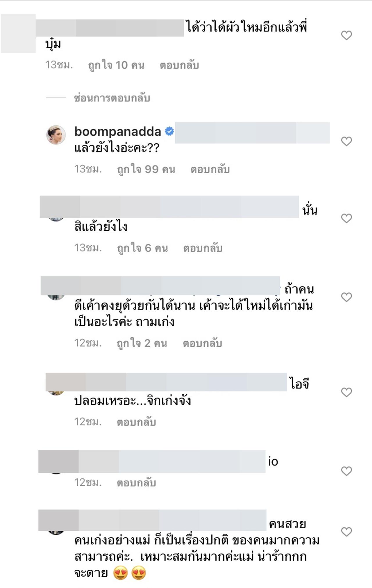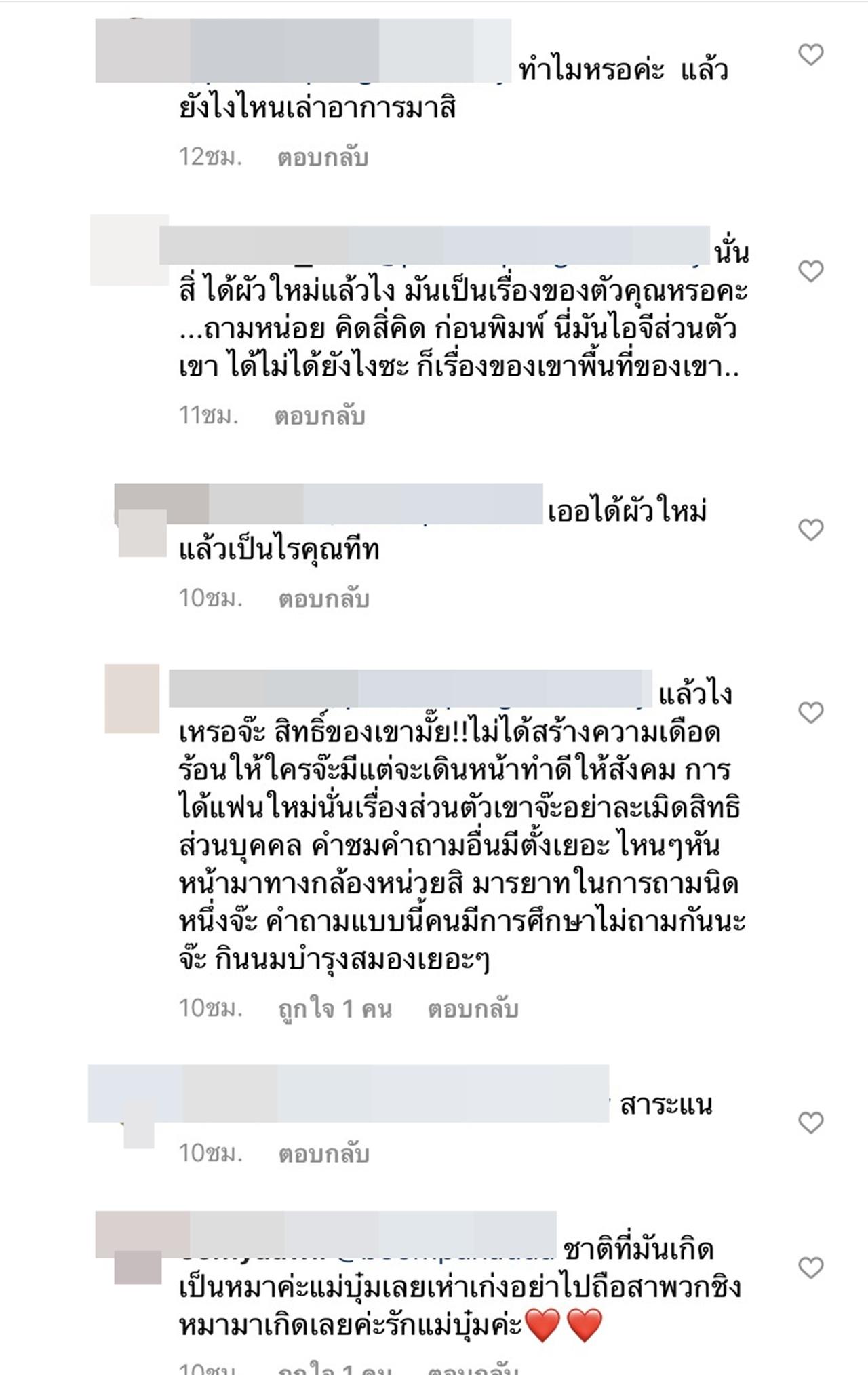 "ได้ว่าได้ผัวใหม่อีกแล้วพี่บุ๋ม" ซึ่งเจ้าตัวก็ตอบกลับทันทีว่า "แล้วยังไงอ่ะคะ??" งานนี้ทำเอาแฟนคลับถึงกับปรี๊ดแตกคอมเมนต์ฟาดกลับแบบเจ็บๆ ว่า “ถ้าคนดี เขาอยู่ด้วยกันได้นาน เขาจะได้ใหม่ได้เก่ามันเป็นอะไรคะ ถามเก่ง” หรือจะเป็น “มารยาทนิดหนึ่งนะคะ มันควรมั้ยอ่ะ”