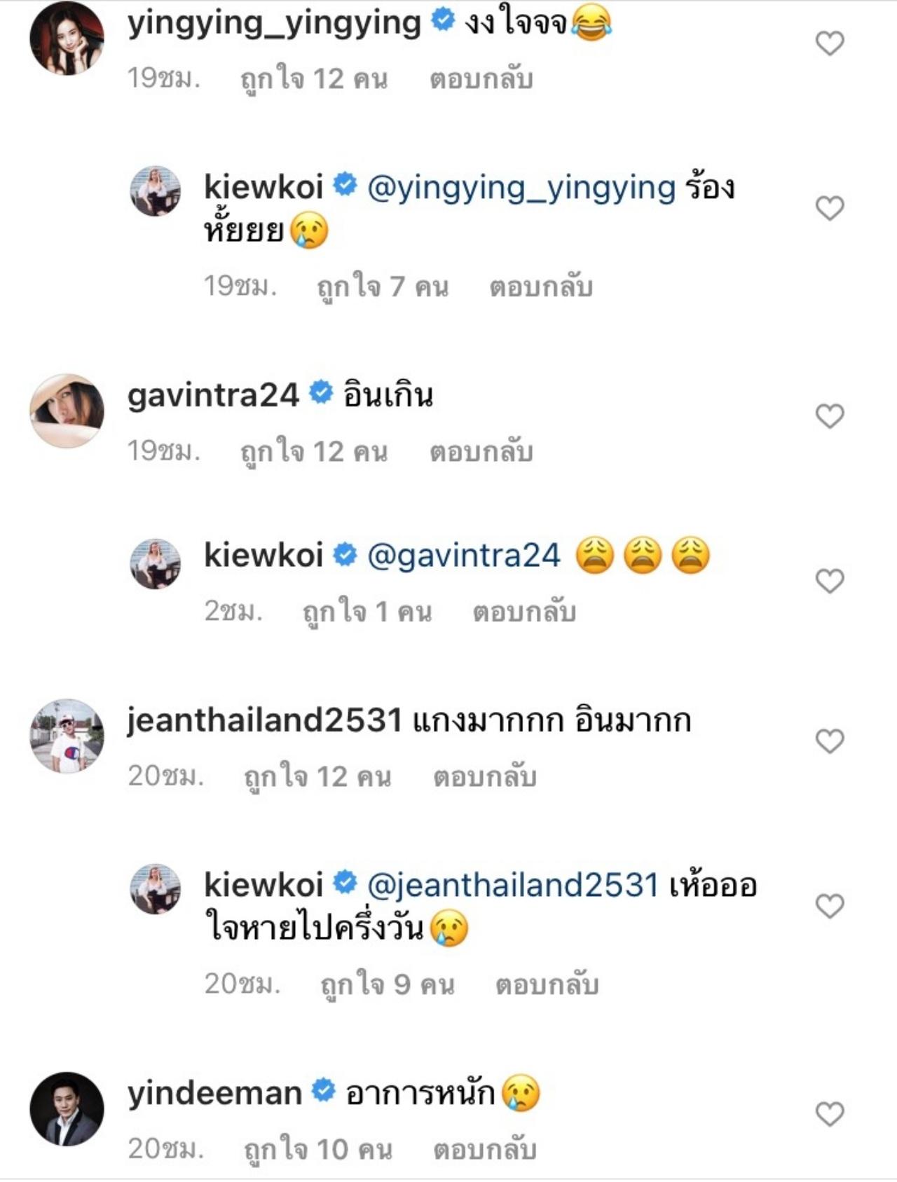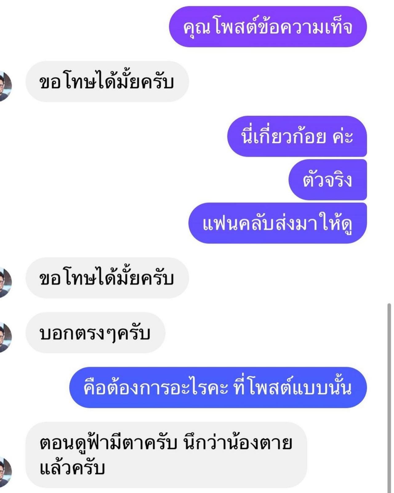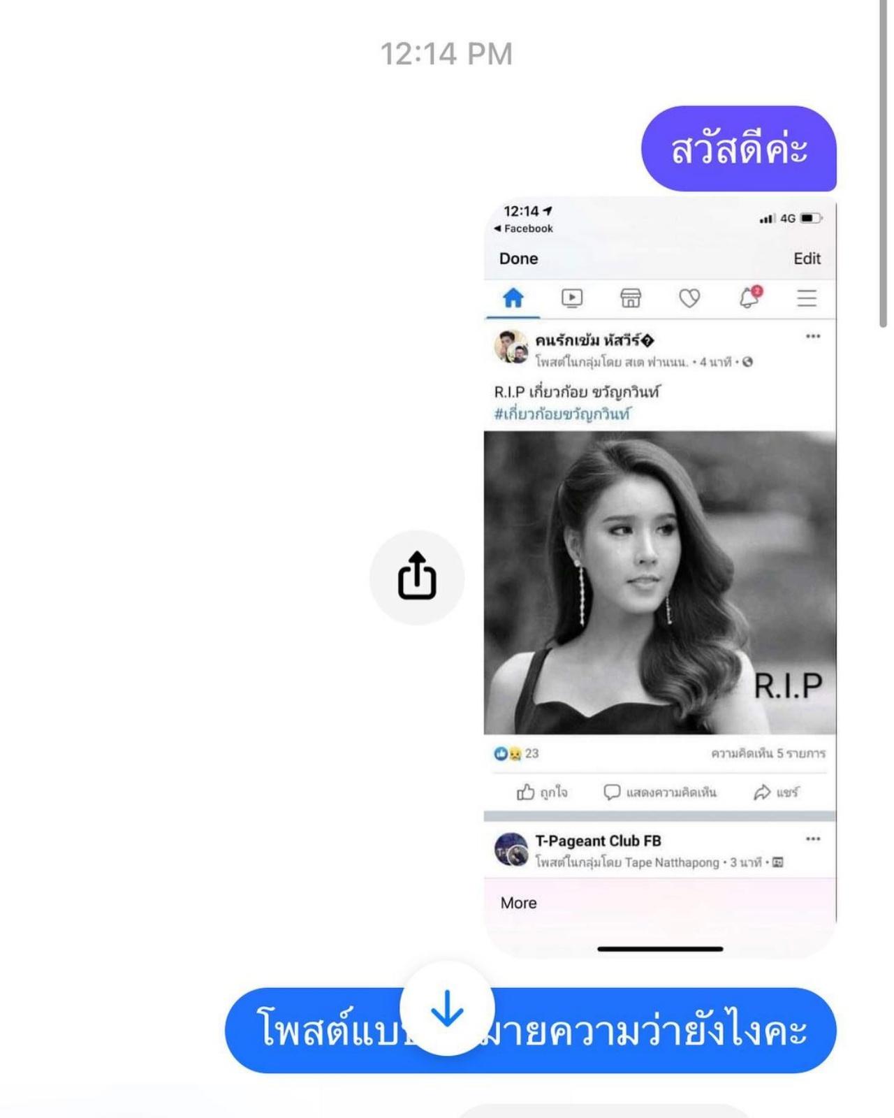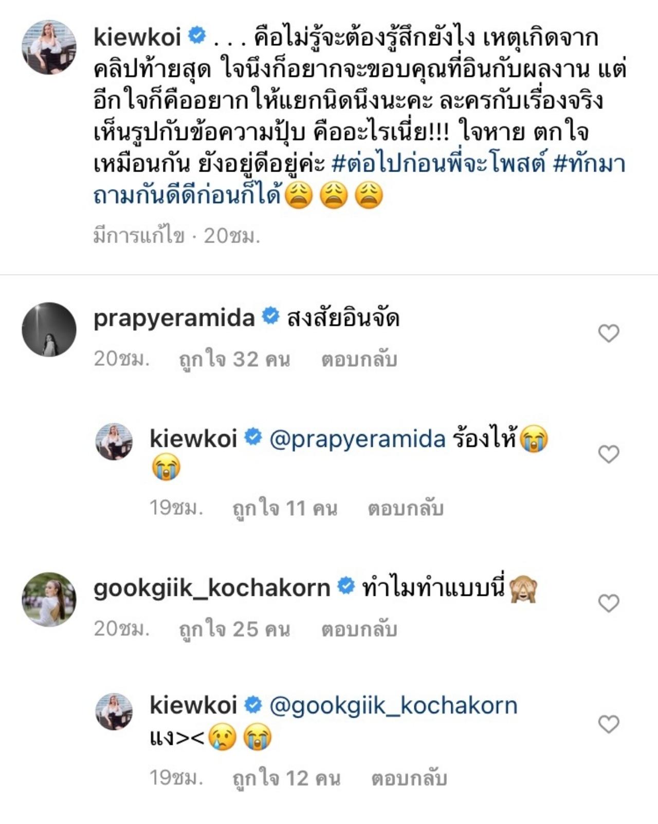 งานนี้ทำเอา เกี่ยวก้อย รู้สึกไม่โอเคอย่างหนัก เจ้าตัวได้โพสต์ข้อความแชตพร้อมเขียนแคปชั่นว่า "คือไม่รู้จะต้องรู้สึกยังไง เหตุเกิดจากคลิปท้ายสุด ใจนึงก็อยากจะขอบคุณที่อินกับผลงาน แต่อีกใจก็คืออยากให้แยกนิดนึงนะคะ ละครกับเรื่องจริง เห็นรูปกับข้อความปุ๊บ คืออะไรเนี่ย!!! ใจหาย ตกใจเหมือนกัน ยังอยู่ดีอยู่ค่ะ #ต่อไปก่อนพี่จะโพสต์ #ทักมาถามกันดีดีก่อนก็ได้"