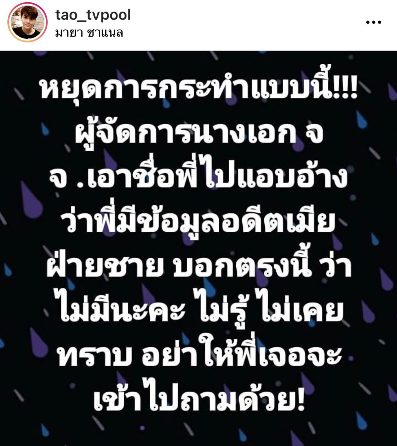 ล่าสุด เต๋า ทีวีพูล ก็ได้โพสต์ข้อความผ่านทางอินสตาแกรมของตัวเอง ซึ่งมีข้อความว่า “หยุดการกระทำแบบนี้!!! ผู้จัดการนางเอก จจ. เอาชื่อพี่ไปแอบอ้างว่าพี่มีข้อมูลอดีตเมียฝ่ายชาย บอกตรงนี้ว่าไม่มีนะคะ ไม่รู้ ไม่เคยทราบ อย่าให้พี่เจอจะเข้าไปถามด้วย!”.