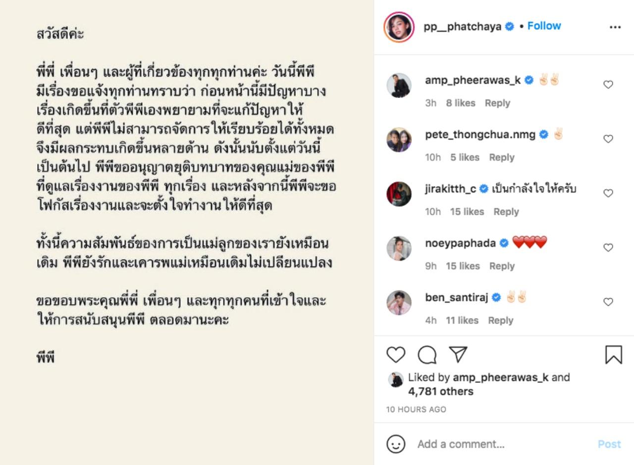 ดังนั้นนับตั้งแต่วันนี้เป็นต้นไป พีพีขออนุญาตยุติบทบาทของคุณแม่ของพีพีที่ดูแลเรื่องงานของพีพี ทุกเรื่อง และหลังจากนี้พีพีจะขอโฟกัสเรื่องงานและจะตั้งใจทำงานให้ดีที่สุด