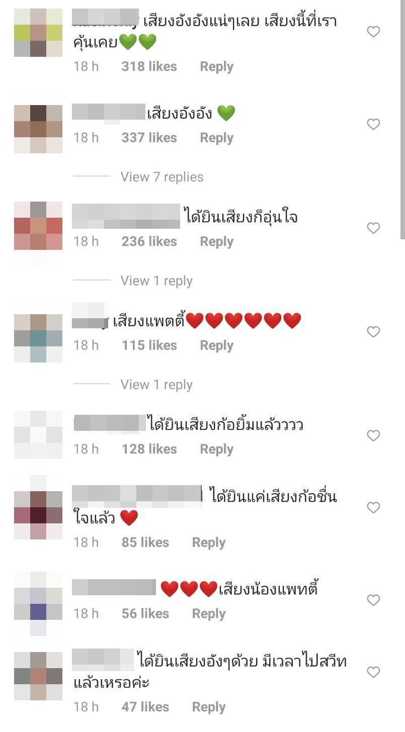 งานนี้แฟนคลับแห่เข้าไปคอมเมนต์ และมั่นใจว่าเป็นเสียงของแพทตี้แน่นอน อาทิ ได้ยินเสียงอังๆ ด้วย มีเวลาไปสวีทแล้วเหรอคะ, ได้ยินเสียงก็อุ่นใจ, เสียงอังอังแน่ๆ เลย เสียงนี้ที่เราคุ้นเคย, อังอังยืนหัวเราะให้กำลังใจอยู่, ได้ยินแค่เสียงก็ชื่นใจแล้ว ฯลฯ