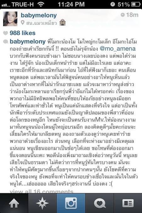 ขอโทษที่ต้องออกมาชี้แจงตอนนี้นะคะ พอดีน้องเพิ่งมาถามเชิงต่อว่าหนูวันนี้ หนูเลยเสียใจเป็นธรรมดา ไม่คิดว่าการที่หนูรู้ทันใครบางคน มันจะทำให้หนูมีศัตรูมากขึ้นเรื่อยๆ จากปากคนคนนั้น ยังโชคดีที่ความจริงใจของหนู ยังพอที่จะทำให้คนรอบข้างเชื่อใจและมั่นใจในตัวหนูได้…เฮ่อออ เสียใจจริงๆ ฮร่ะงานนี้ บ่องตง :(”
