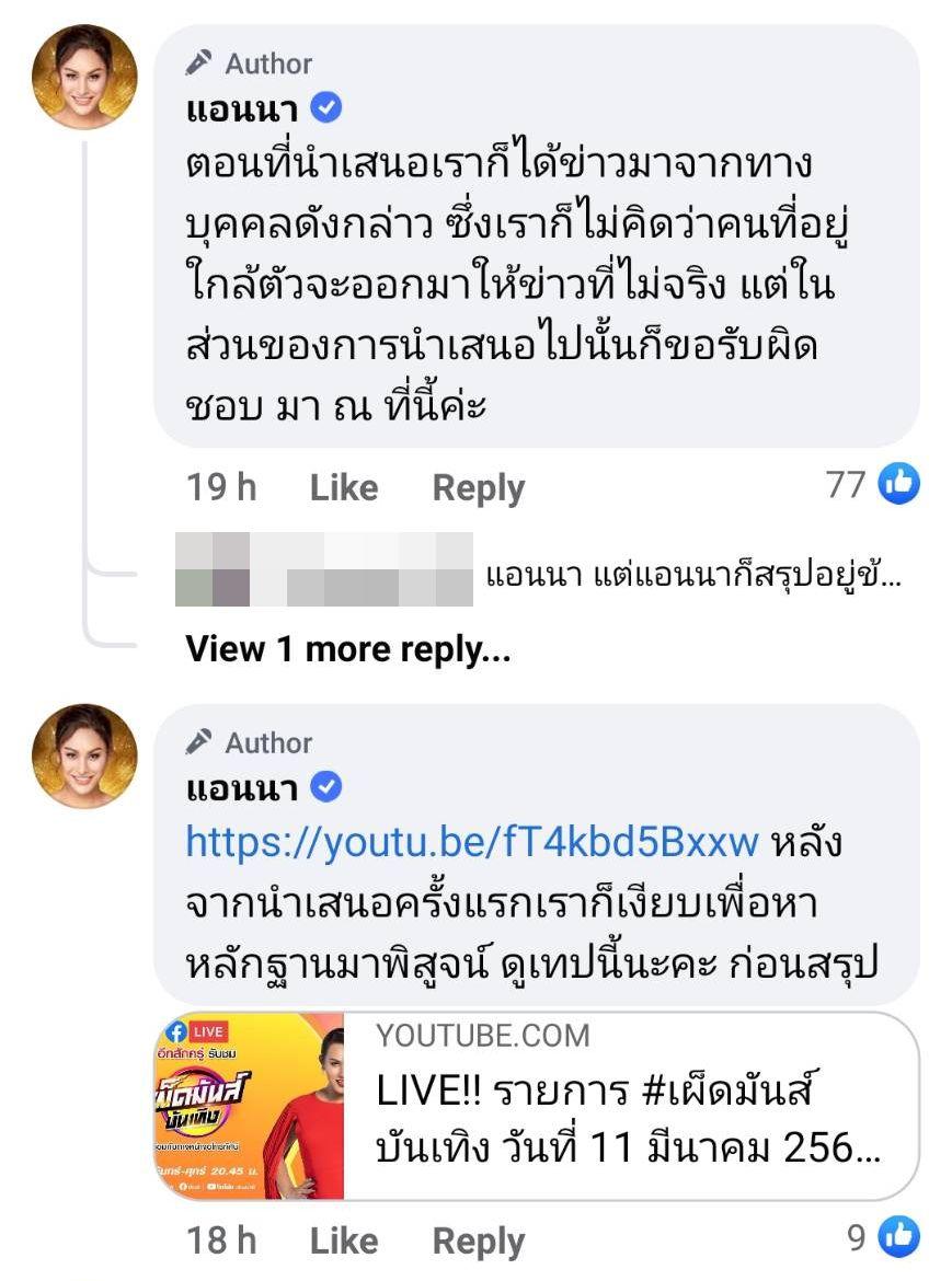 พร้อมทั้งเขียนข้อความเพิ่มเติมในคอมเมนต์ว่า “ตอนที่นำเสนอเราก็ได้ข่าวมาจากทางบุคคลดังกล่าว ซึ่งเราก็ไม่คิดว่าคนที่อยู่ใกล้ตัวจะออกมาให้ข่าวที่ไม่จริง แต่ในส่วนของการนำเสนอไปนั้นก็ขอรับผิดชอบ มา ณ ที่นี้ค่ะ” และ “หลังจากนำเสนอครั้งแรกเราก็เงียบเพื่อหาหลักฐานมาพิสูจน์ ดูเทปนี้นะคะ ก่อนสรุป” โดยมีชาวเน็ตคอมเมนต์ทั้งให้กำลังใจและวิพากษ์วิจารณ์.