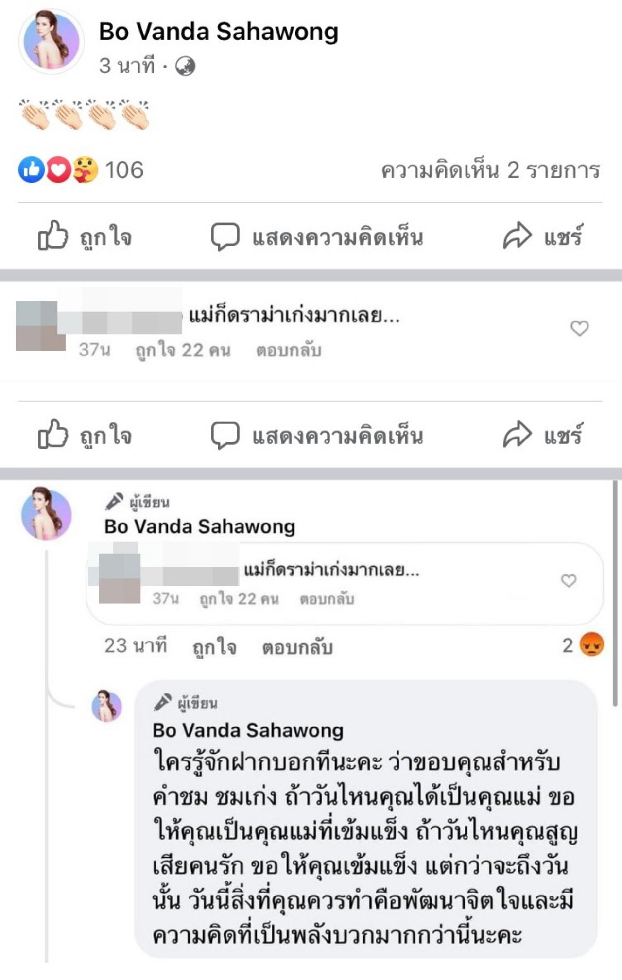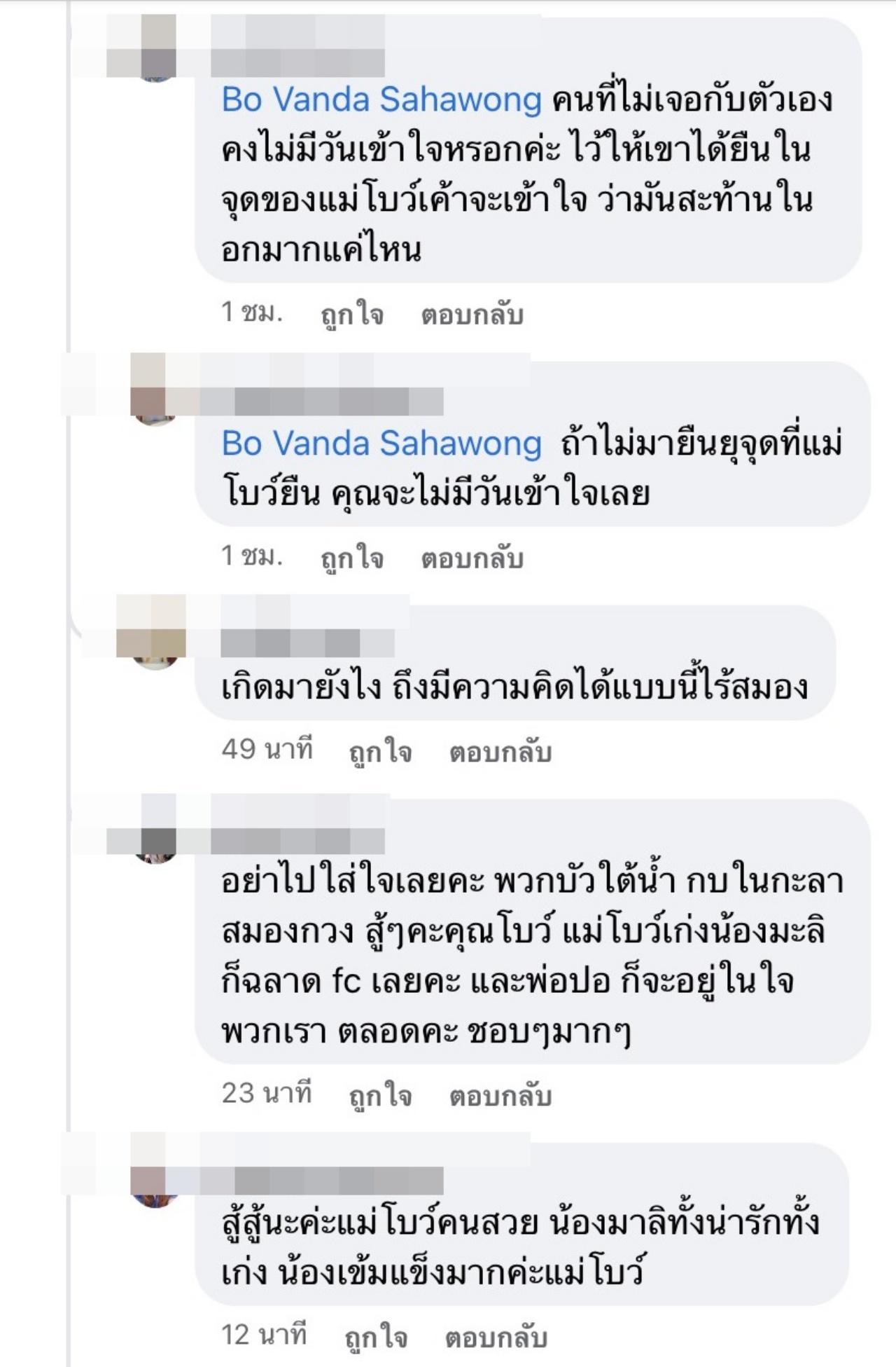 แต่หลังจากที่แม่โบว์โพสต์รูปและข้อความดังกล่าวไปไม่นานก็มีชาวเน็ตรายหนึ่งเข้ามาคอมเมนต์แซะแม่โบว์ว่า “แม่ก็ดราม่าเก่งมากเลย...” ซึ่งงานนี้ โบว์ แวนด้า ไม่นิ่งเฉย เข้ามาคอมเมนต์ตอบกลับชาวเน็ตคนดังกล่าวว่า