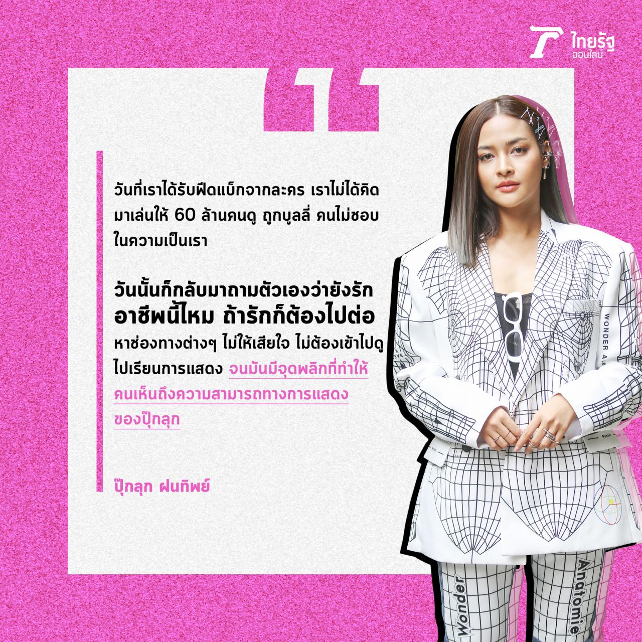 เราย้อนถาม ปุ๊กลุก ไปว่า ตอนที่ได้รู้ความจริงแล้วว่า การเป็นนักแสดง ไม่ได้เหมือนกับความฝันที่เราคิดไว้ เพราะตอนที่คิดไว้มันดูสวยงาม ไม่ได้ดูเหนื่อยและหนักแบบนี้ แถมยังโดนคนด่าเยอะมากขนาดนี้ ยังอยากจะเป็นนักแสดงอยู่มั้ย นางเอกสาวตอบกับเราด้วยน้ำเสียงที่ยังสดใสและฟังดูเบิกบานว่า