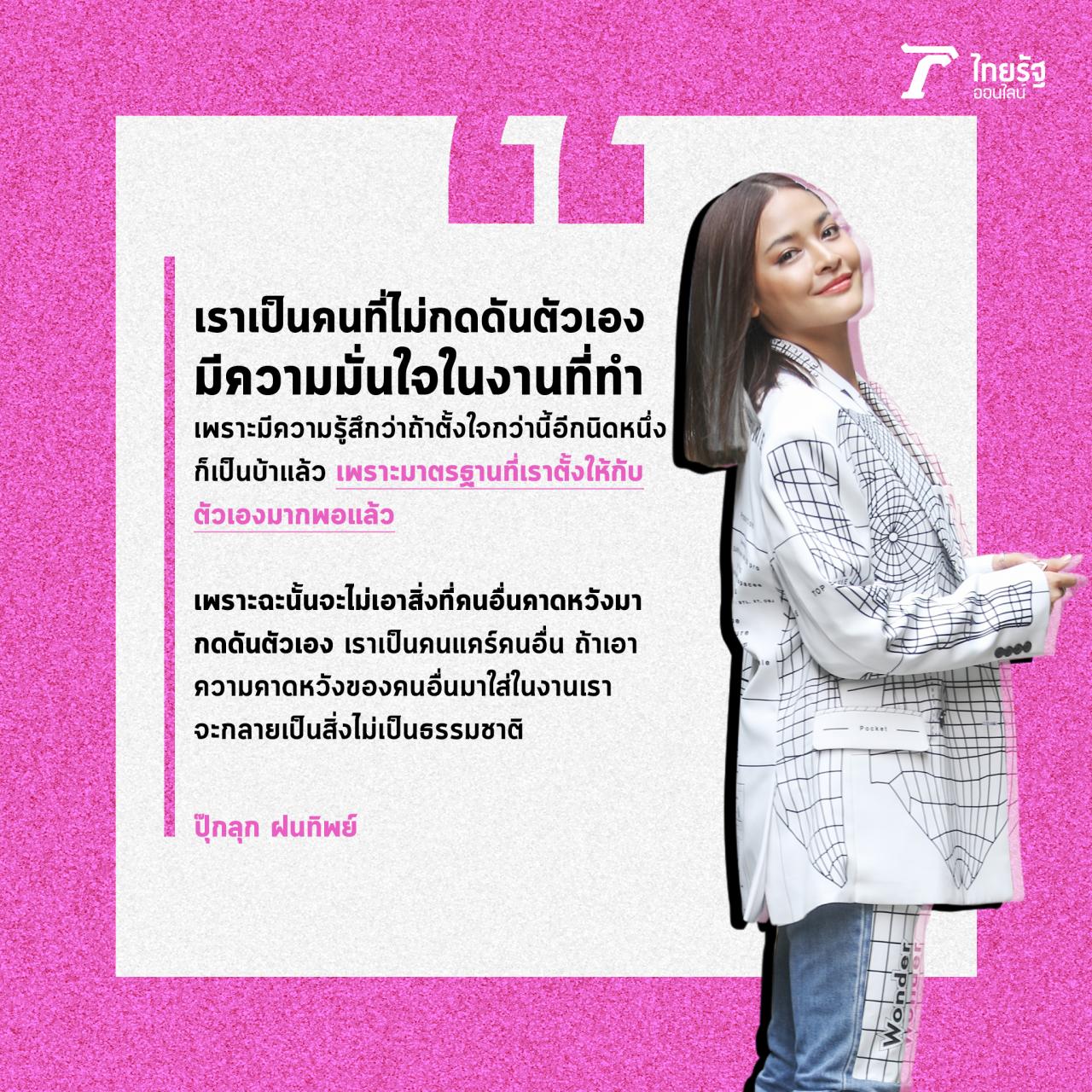 เพราะถูกยกให้เป็นไอดอลในความเป็นสาวมั่น และกล้าที่จะบอกความต้องการของตัวเองว่าอยากจะเป็นอะไร และเดินตามหาฝันของตัวเองหลังจากที่เคยถูกความคิดของคนรอบข้างครอบเอาไว้ว่า อาชีพนักแสดง เป็นอาชีพของคนที่วัลลาบี อยากดังอยากเด่น เราจึงอยากให้ปุ๊กลุกฝากถึงคนที่อยากมีความมั่นใจ มีความฝัน ให้กล้าที่จะก้าวออกมาเหมือนกับปุ๊กลุก ซึ่งเจ้าตัวได้บอกว่า