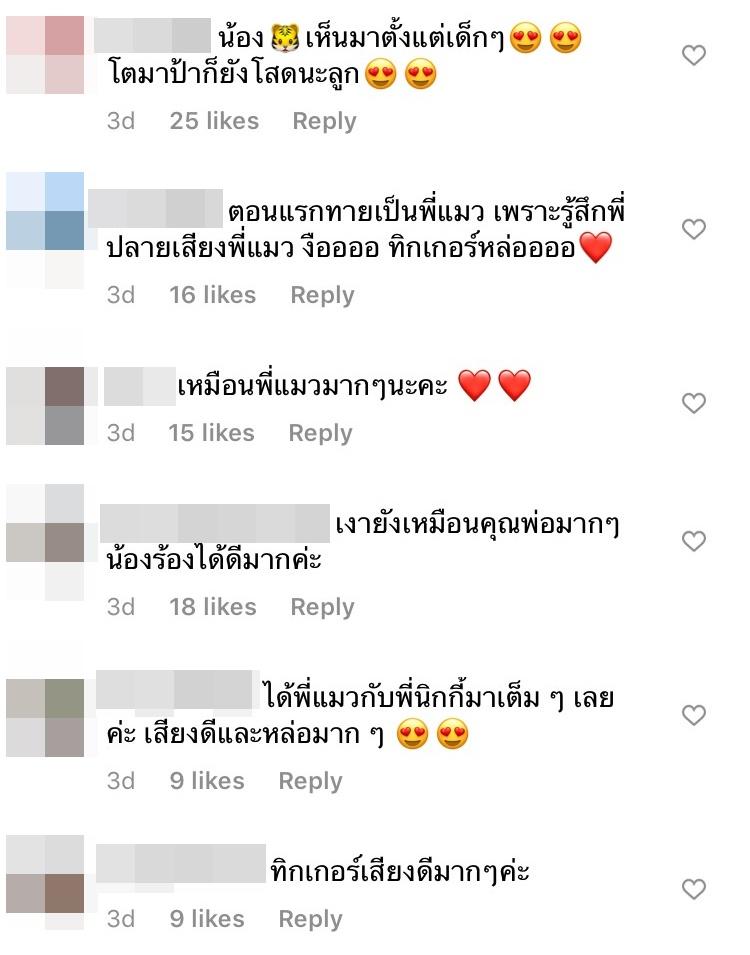 ท่ามกลางคอมเมนต์จากชาวเน็ตจำนวนมากที่เข้ามาชื่นชมพร้อมบอกเป็นเสียงเดียวกันว่า อาทิ “น้องทิกเกอร์เหมือนคุณพ่อมากๆ น้องเอาส่วนที่ดีที่สุดของคุณพ่อคุณแม่มาทั้งหมดค่ะ หล่อละมุน อบอุ่นมาก ร้องเพลงได้ไพเราะ, เงายังเหมือนคุณพ่อมากๆ น้องร้องได้ดีมากค่ะ, ตอนแรกทายเป็นพี่แมว เพราะรู้สึกปลายเสียงพี่แมว งืออออ ทิกเกอร์หล่ออออ, เหมือนพี่แมวมากๆ นะคะ” เป็นต้น