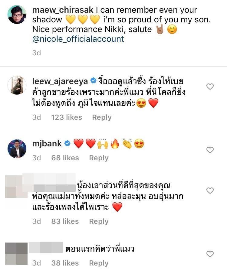 ล่าสุดนักร้องหนุ่มชื่อดัง แมว จิรศักดิ์ ปานพุ่ม เห็นคลิปลูกชายร้องเพลงสุดประทับใจกับคุณแม่จนร้องไห้กลางรายการ ก่อนจะโพสต์ภาพลูกชายที่เห็นเพียงเงา และภาพที่ นิโคล-น้องทิกเกอร์ ร้องเพลงด้วยกัน โดยระบุข้อความภาษาอังกฤษว่า” I can remember even your shadow i’m so proud of you my son. Nice performance Nikki, salute @nicole_officialaccount “ ซึ่งแปลเป็นภาษาไทยว่า “ถึงแม้จะเห็นแค่เงา พ่อก็จำลูกได้ พ่อภูมิใจในตัวลูกมาก เป็นการแสดงที่เยี่ยมมาก นิกกี้ ขอคารวะ”
