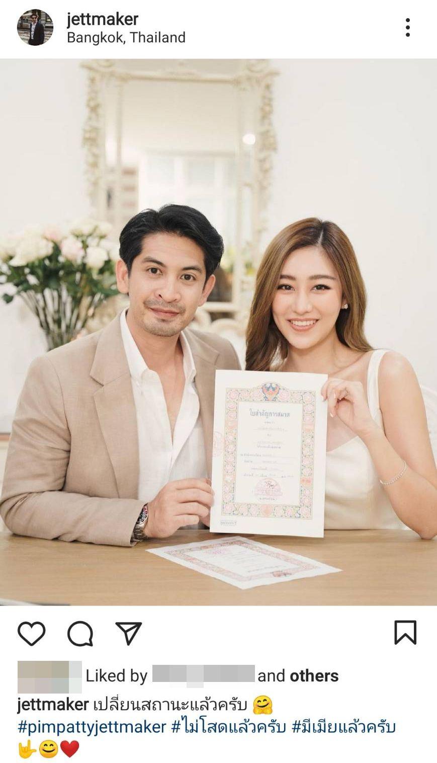 ล่าสุดก็มีข่าวเซอร์ไพรส์อีกครั้ง เมื่อ เจ็ท-แพทตี้ จูงมือไปจดทะเบียนสมรสด้วยกันเรียบร้อยแล้ว โดยเจ็ทได้โพสต์ภาพคู่กับแพทตี้และถือทะเบียนสมรส พร้อมทั้งเขียนข้อความว่า “เปลี่ยนสถานะแล้วครับ #pimpattyjettmaker #ไม่โสดแล้วครับ #มีเมียแล้วครับ” ด้านแพทตี้ก็โพสต์ภาพเดียวกัน และเขียนข้อความว่า “ไม่เป็นแฟนกันละนะ ตอนนี้เป็นคุณสามีแล้ว #pimpattyjettmaker”