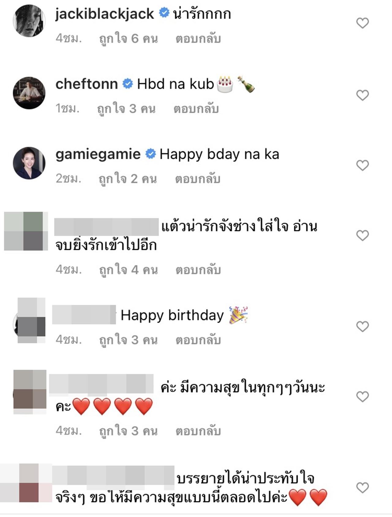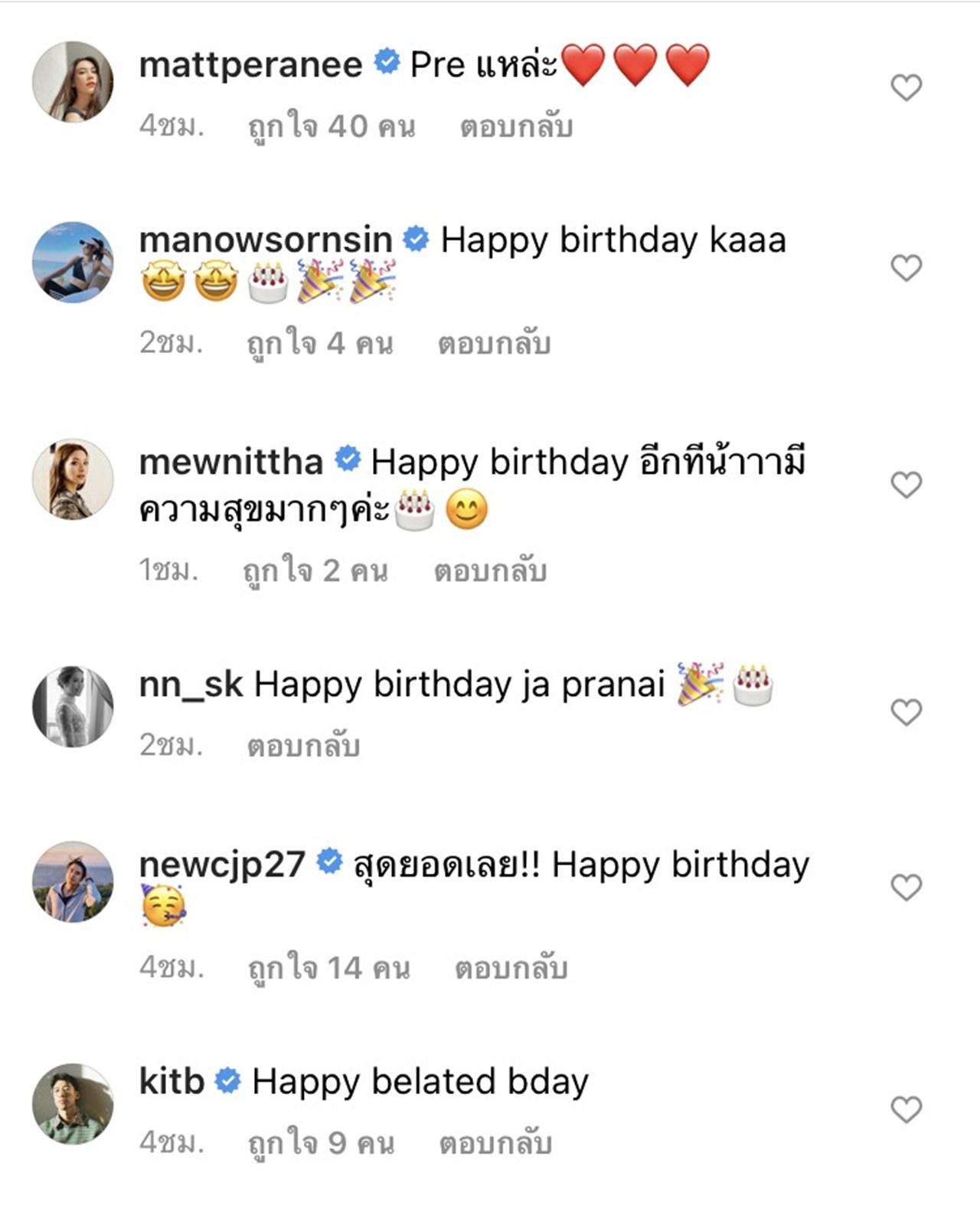 งานนี้เพื่อนๆ ต่างเข้ามาร่วมอวยพรวันเกิด ไฮโซณัย กันเป็นจำนวนมาก รวมถึงสาว แมท ภีรนีย์ ที่เข้ามาแซวว่า "Pre แหล่ะ" ด้านแฟนๆ ที่ติดตามก็เข้ามาชื่นชมในความน่ารักของคู่นี้ โดยบอกว่า ณัย เขียนได้น่าประทับใจมาก ขอให้มีความสุขในทุกๆ วัน.