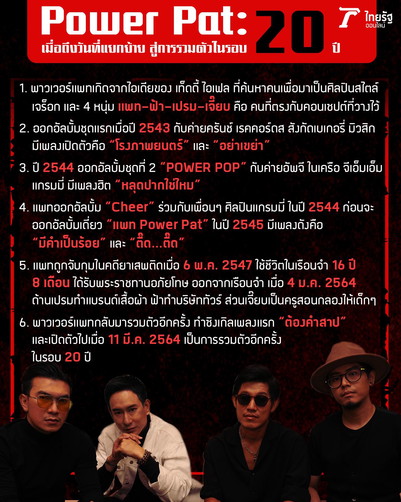 กลายเป็นศิลปินฮอตที่คิวงานแน่นไปหลายเดือนแล้ว สำหรับ “พาวเวอร์แพท” (Power Pat) ที่ประกอบไปด้วย 4 หนุ่ม แพท วรยศ บุญทองนุ่ม (ร้องนำ), ฟ้า ปัณณวิช สุวัฒนานันท์ (กีตาร์), เปรม วริทธิ์ธร ธนาวัฒน์ศิริ (เบส) และ เจี๊ยบ กมลชัย เข็มทอง (กลอง) ที่ล่าสุดกลับมารวมตัวอีกครั้งในรอบ 20 ปี หลังจากแพทออกจากเรือนจำ บันเทิงไทยรัฐออนไลน์ชวน 4 หนุ่มมาพูดคุยถึงวันแรกที่รวมตัวกัน ก่อนจะต้องแยกย้ายไปใช้ชีวิต หมดไฟในการเล่นดนตรี แต่เพราะความมุ่งมั่นของแพทที่อยากกลับมาทำงานเพลงที่รักอีกครั้ง และดึงไฟในตัวเพื่อนๆ กลับมาได้ จึงแท็กทีมกลับมาสร้างความสุขให้กับแฟนเพลงได้อีกครั้ง