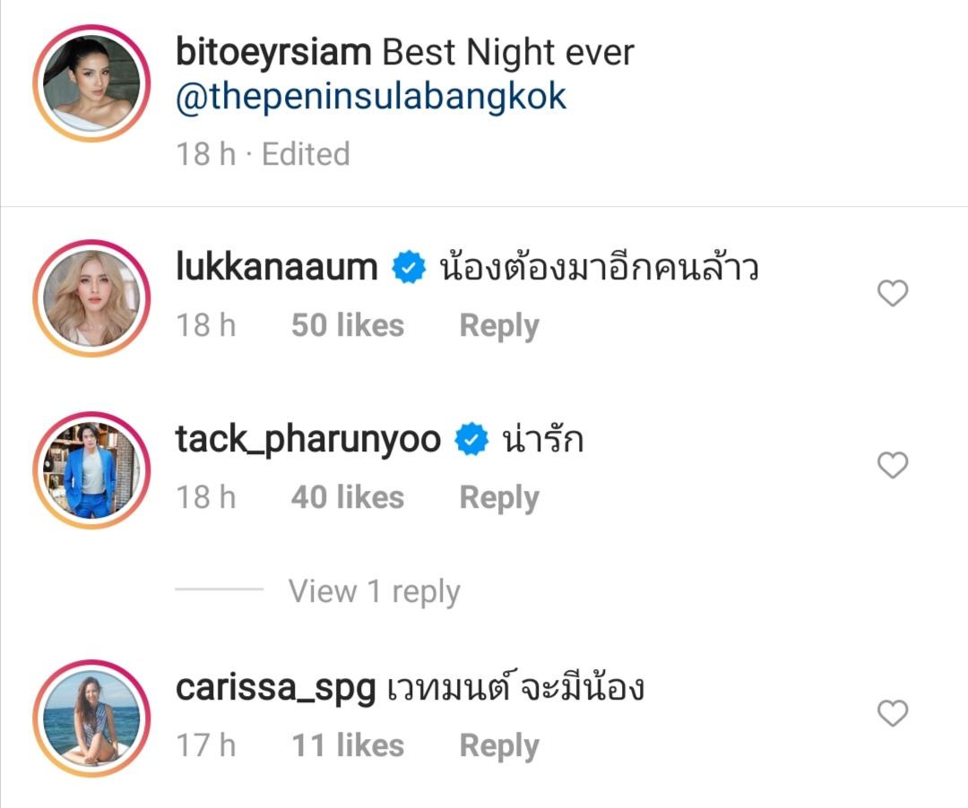 งานนี้นอกจากแฟนๆ จะกดไลค์รัวๆ ต่างก็แซวว่าเห็นทีงานนี้น้องเวทย์มนจะมีน้องเพิ่มซะแล้ว รวมไปถึงคนในวงการบันเทิงก็เข้ามาแซวกระหน่ำ อาทิ อุ้ม ลักขณา, แทค ภรัณยู, คารีสา สปริงเก็ตต์, มะนาว ศรศิลป์, เก๋ ชลลดา ฯลฯ