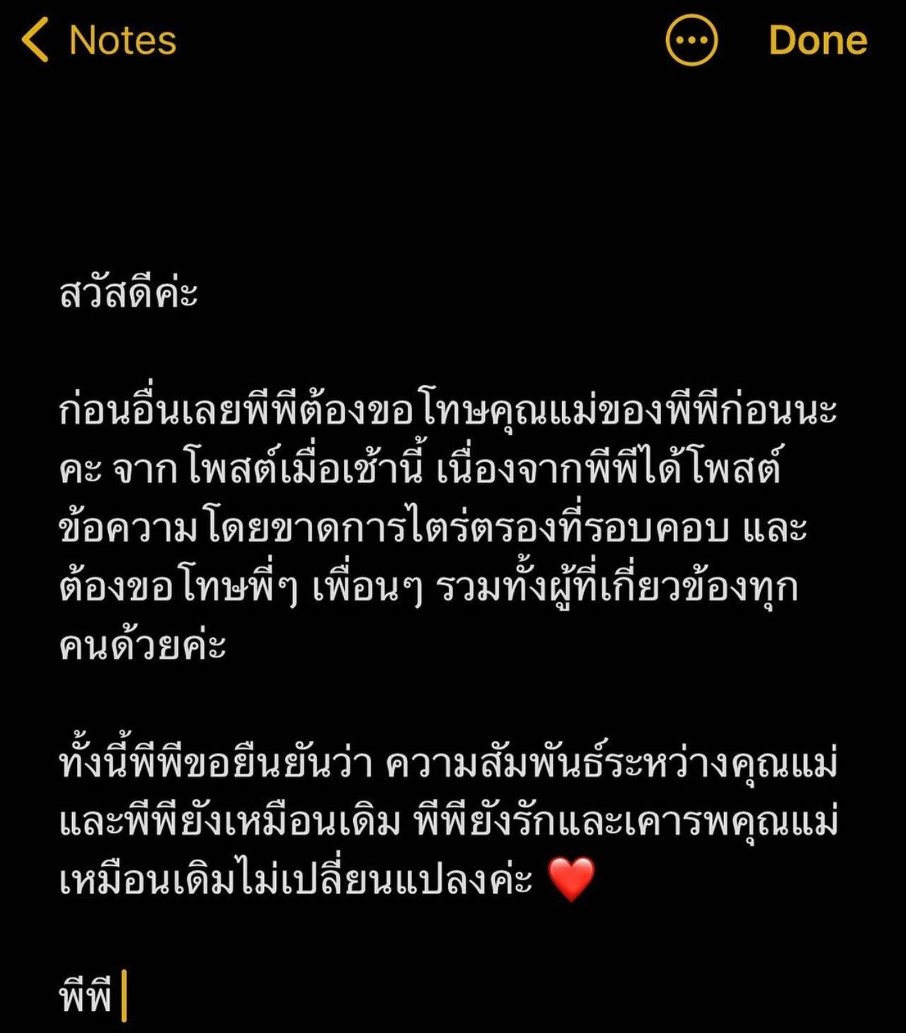 "ตอนที่โพสต์ไปต้องขอโทษทุกคนก่อน (ยกมือไหว้) ที่อาจจะทำให้เข้าใจผิดกับคำพูดหรือการสื่อสาร จะบอกว่าช่วงก่อนหน้านี้สักพักหนึ่ง พีพียังไม่มีผู้จัดการเข้ามาดูแล จะเป็นคุณแม่ที่ดูแลเรื่องงาน พอมันมีปัญหาบางอย่างที่ไม่เข้าใจแล้ว ไม่อยากให้คุณแม่ต้องมาเหนื่อยแล้ว