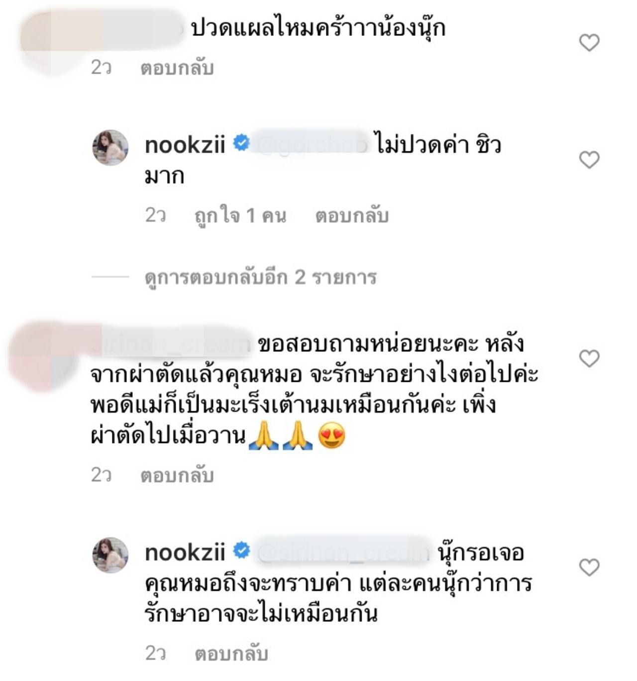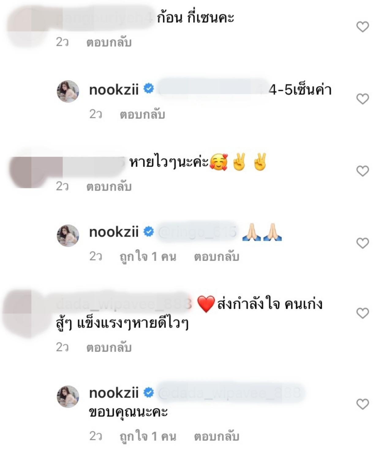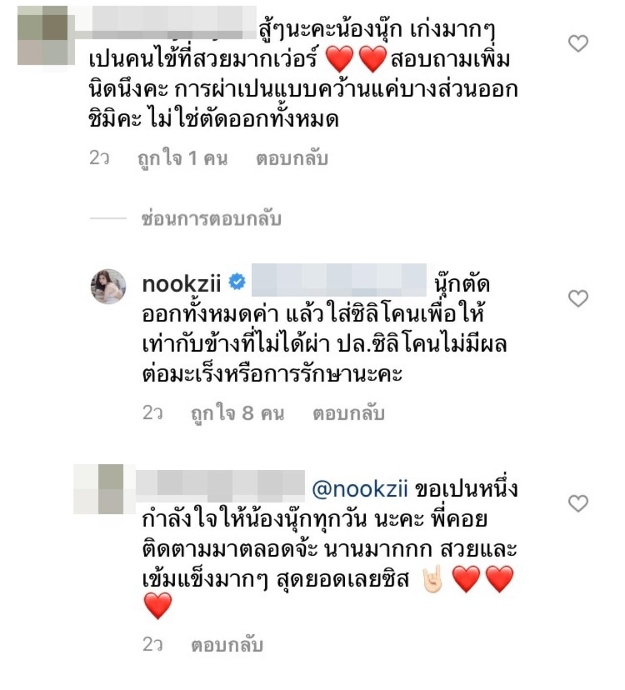 จากนั้นหลายคนที่ติดตามก็ได้เข้ามาให้กำลังใจพร้อมกับอวยพร ขอให้ นุ๊กซี่ หายเร็วๆ ทั้งนี้เจ้าตัวก็ได้ตอบกลับคอมเมนต์หลายคนที่เข้ามาสอบถามเกี่ยวกับโรคนี้ อีกทั้งยังช่วยแนะนำอีกด้วย และ นุ๊กซี่ ก็บอกว่า การทำหน้าอกใส่ซิลิโคน ไม่มีผลต่อมะเร็งและการรักษา.