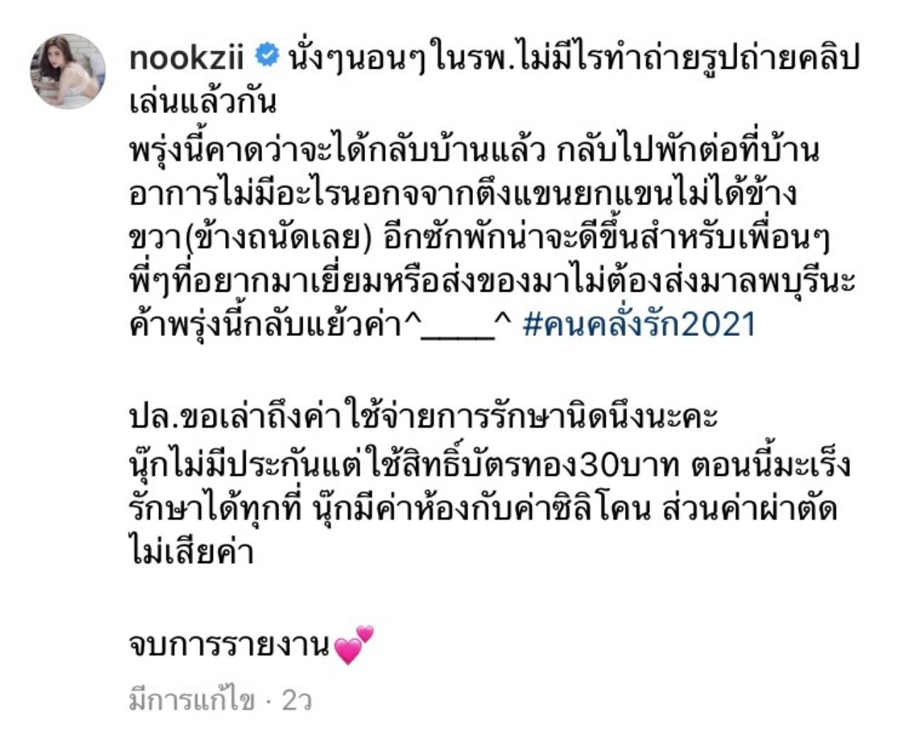 เข้ารับการผ่าตัดมะเร็งเต้านม ที่โรงพยาบาลศูนย์มะเร็งลพบุรีเป็นเวลา 7 วัน สำหรับ นุ๊กซี่ อัญพัชญ์ แฟนสาวของ ปู แบล็คเฮด หรือ ปู อานนท์ สายแสงจันทร์ โดยตลอดการเข้ารับการรักษาตัว หวานใจหนุ่มดูแลดีไม่ห่าง และตอนนี้ นุ๊กซี่ ก็ออกจากโรงพยาบาลแล้ว กลับไปพักฟื้นตัวต่อที่บ้าน รอร่างกายแข็งแรงเพื่อที่จะให้คีโมต่อไป