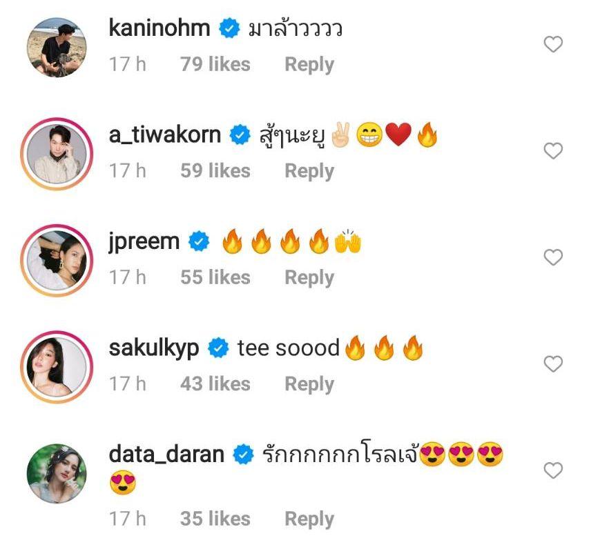 และแน่นอนว่าคอมเมนต์ในไอจีเต็มไปด้วยอีโมจิไฟลุก พร้อมทั้งคำชมเต็มไอจีเลยทีเดียว ส่วนเพื่อนๆ ในวงการบันเทิงคอมเมนต์หลายคน อาทิ เบลล่า ราณี “ยอมจ้ะแม่”, จันจิ จันจิรา “ดีมากอ่ะแม่!!” และใส่อีโมจิไฟลุก, โอม คณิน “มาล้าวววว” ฯลฯ