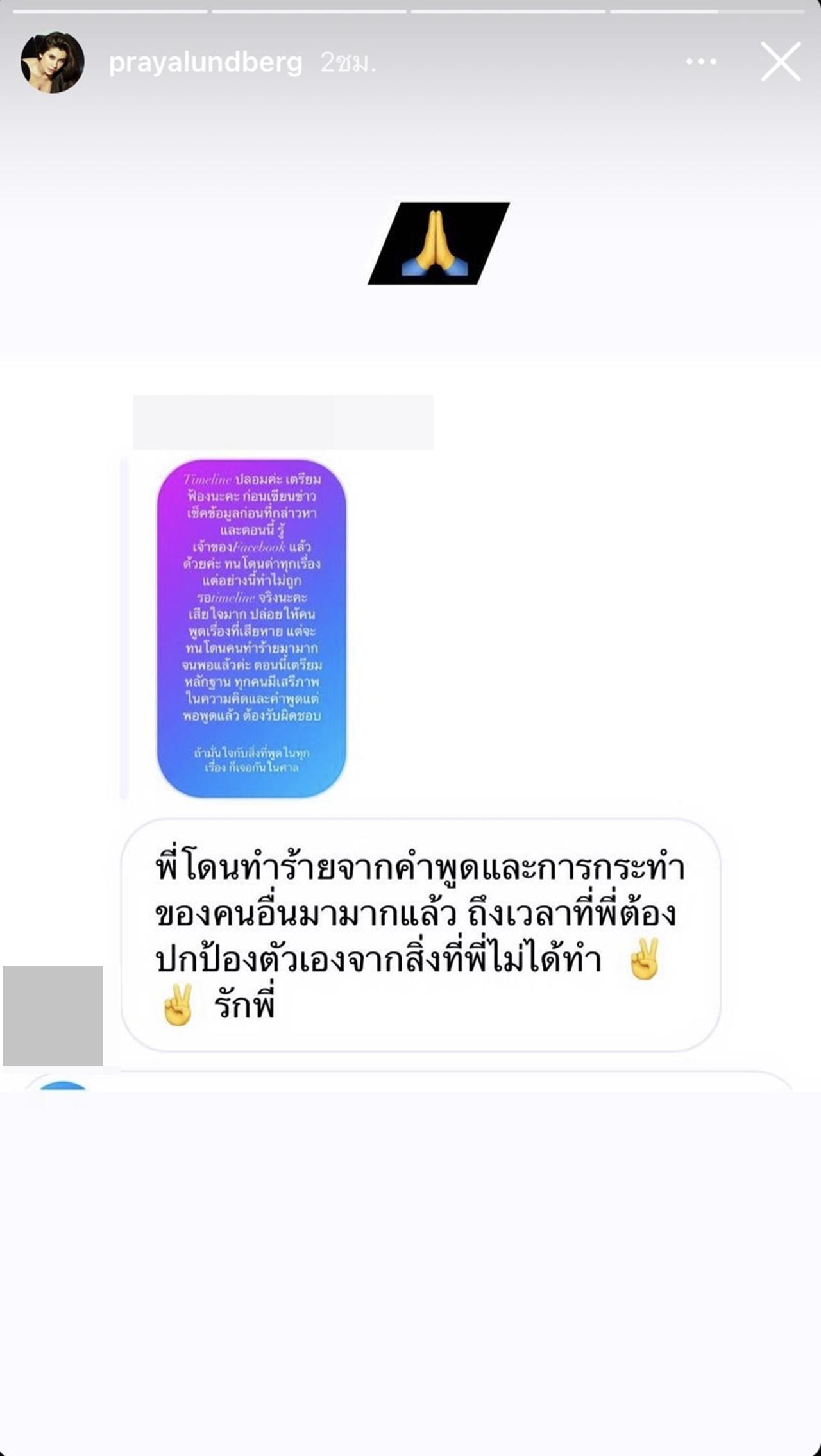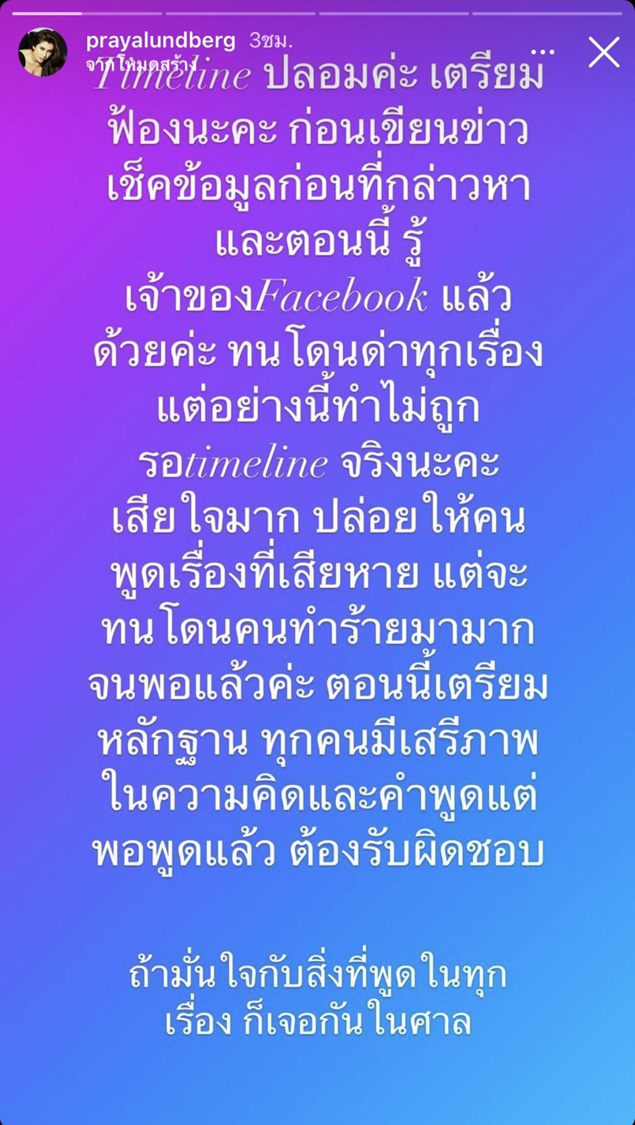 จากนั้นนักแสดงสาว ปู ไปรยา ก็ได้โพสต์ข้อความผ่านทางไอจีสตอรี่ของตัวเองว่า “ไทม์ไลน์ปลอมค่ะ เตรียมฟ้องนะคะ ก่อนเขียนข่าวอะไร เช็กข้อมูลก่อนที่จะกล่าวหา