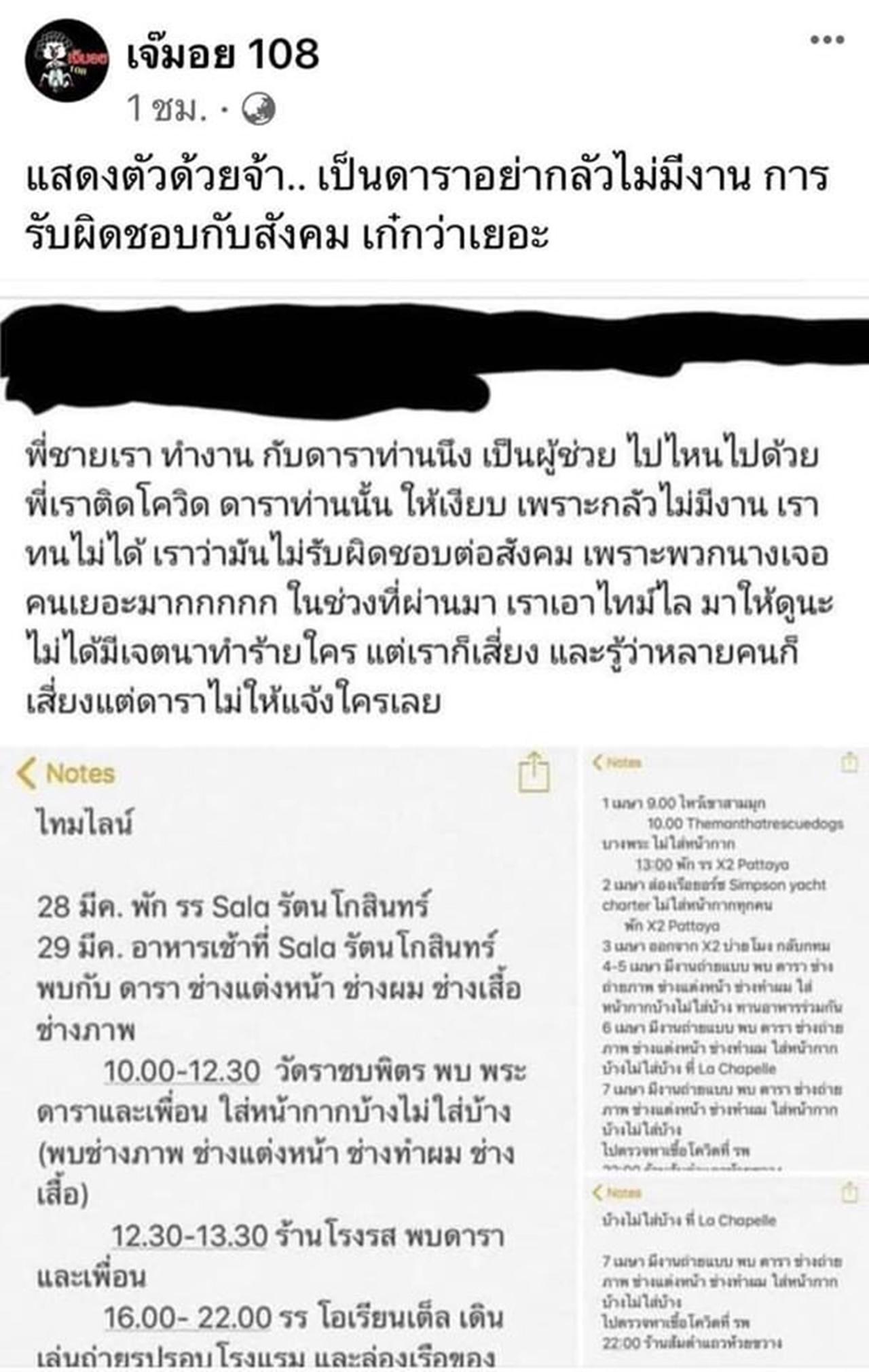โดยบุคคลดังกล่าวอ้างว่าที่ดาราทำแบบนี้ไม่รับผิดชอบต่อสังคม และยังได้เอาไทม์ไลน์ของพี่ชายตนเองออกมาชี้แจง โดยบุคคลดังกล่าวยืนยันว่าที่ต้องออกมาบอกทุกคน ไม่ได้มีเจตนาร้ายต่อใคร แต่ดาราคนนี้เสี่ยง แต่กลับไม่แจ้งใครเลย