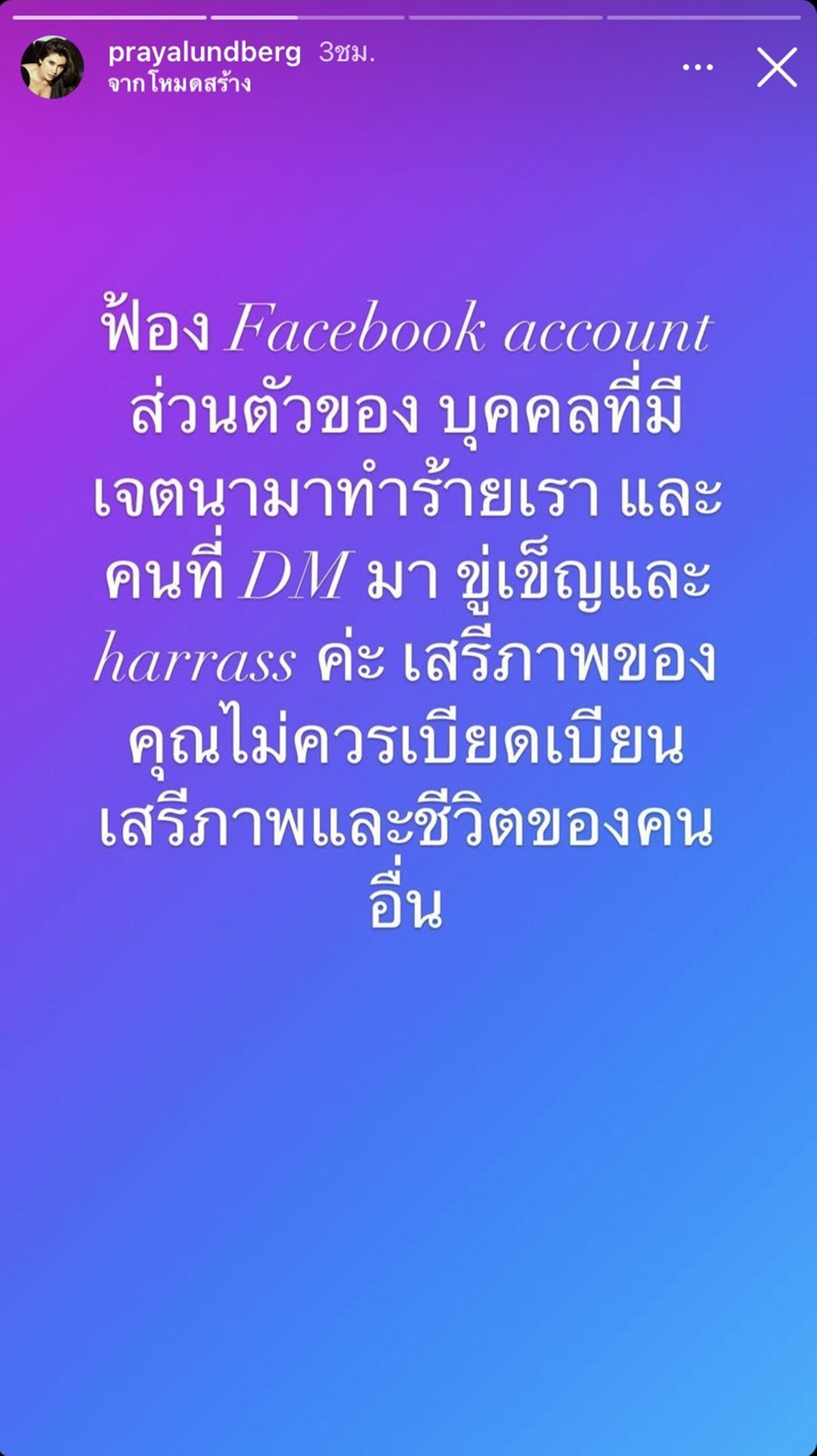 ฟ้องเฟซบุ๊กส่วนตัวของบุคคลที่มีเจตนามาทำร้ายเรา และคนที่ไดเร็กมาขู่เข็ญและ harrass (ก่อกวน) เสรีภาพของคุณไม่ควรเบียดเบียนเสรีภาพและชีวิตของคนอื่น”