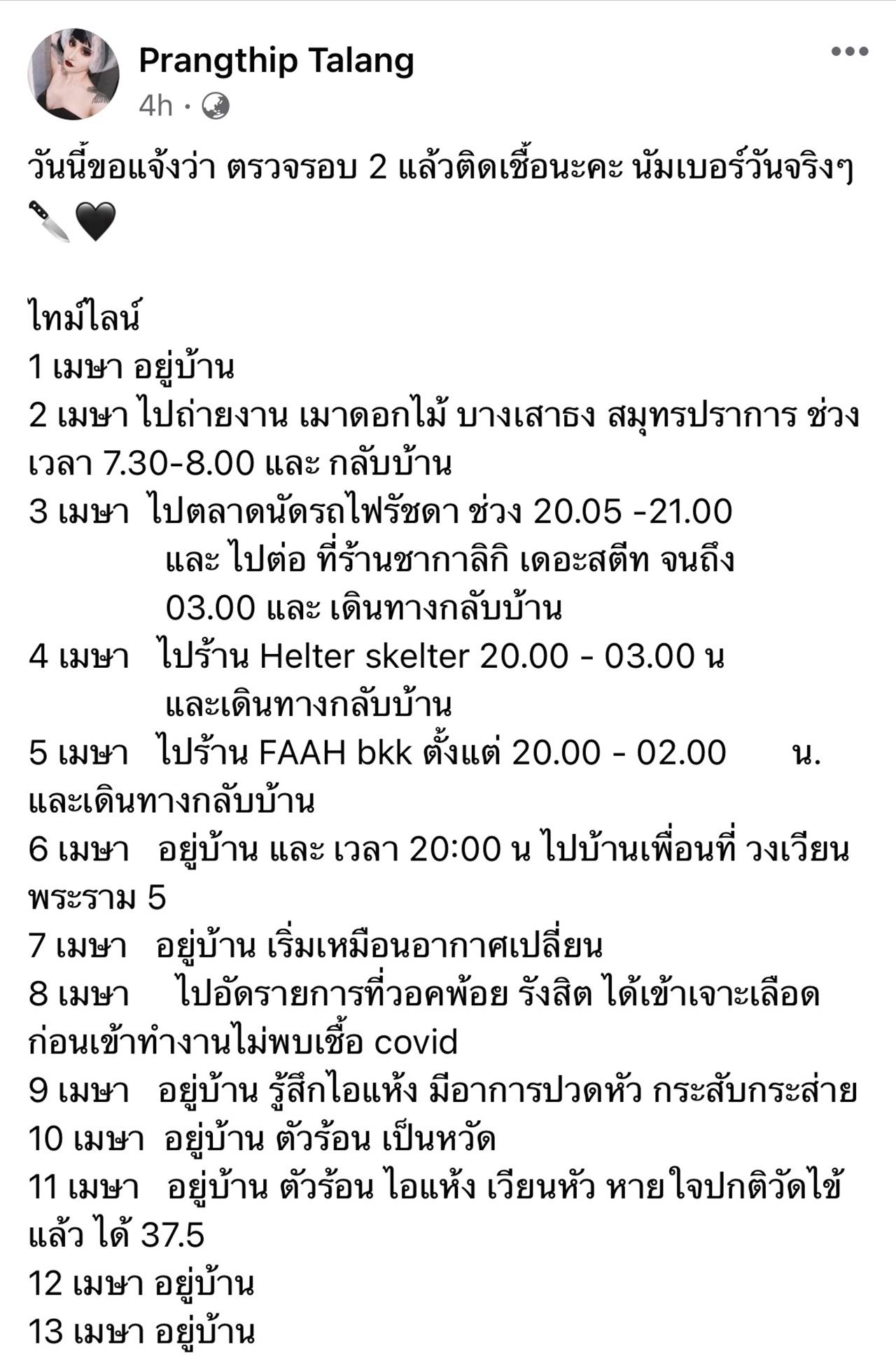 "วันนี้ขอแจ้งว่า ตรวจรอบ 2 แล้วติดเชื้อนะคะ นัมเบอร์วันจริงๆ" พร้อมระบุไทม์ไลน์ของตัวเองเพื่อให้ทุกคนได้รับทราบดังนี้